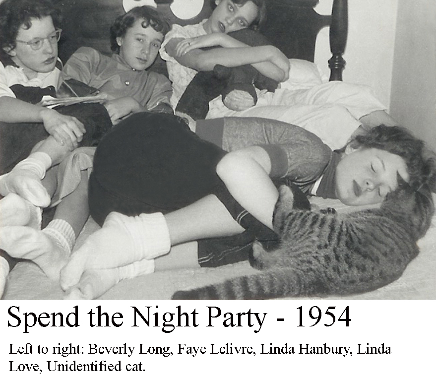 - Beverly Long ’58, Faye Lelievre ’58, Linda Hanbury ’58, and Linda Love ’57 at Spend The Night Party at Unidentified House about the time they entered WEHS
