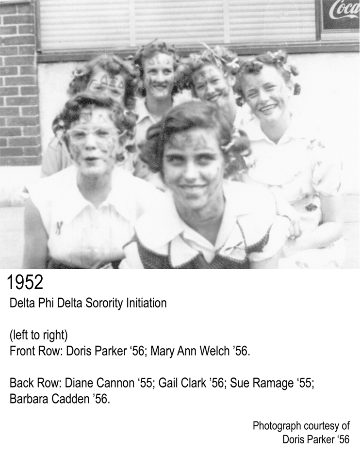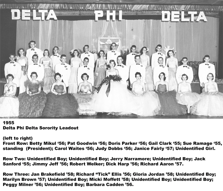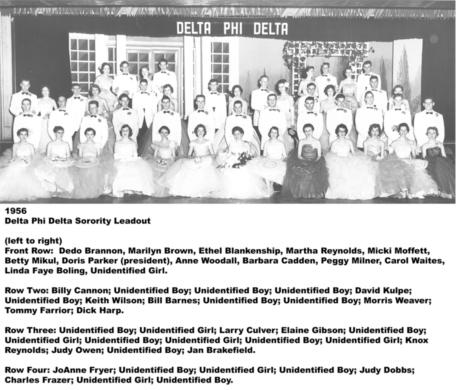 - DeltaPhiDelta Sorority Leadout: Dedo Brannon ’57; Marilyn Brown ’57; Ethel Blankenship ’57; Martha Reynolds ’58; Micki Moffett ’58; Betty Mikul ’56; Doris Parker ’56; Anne Woodall ’56; Barbara Cadden ’56; Peggy Milner ’56; Carol Waites ’56; Linda Faye Boling ’57; Billy Cannon ’56; David Kulpe ’57; Keith Wilson ’54; Bill Barnes ’55; Morris Weaver ’58; Tommy Farrior ’57; Dick Harp ’56; Larry Culver ’55; Elaine Gibson ’58; Knox Reynolds ’58; Judy Owen ’58; Jan Brakefield ’58; JoAnne Fryer ’57; Judy Dobbs ’56; Charles Frazer ’56