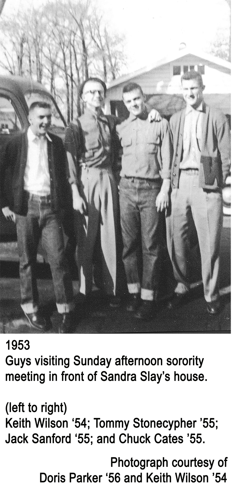 - Visiting site of Delta Phi Delta Sorority Meeting: Keith Wilson ’54; Tommy Stonecypher ’55; Jack Sanford ’55; and Chuck Cates ’55.