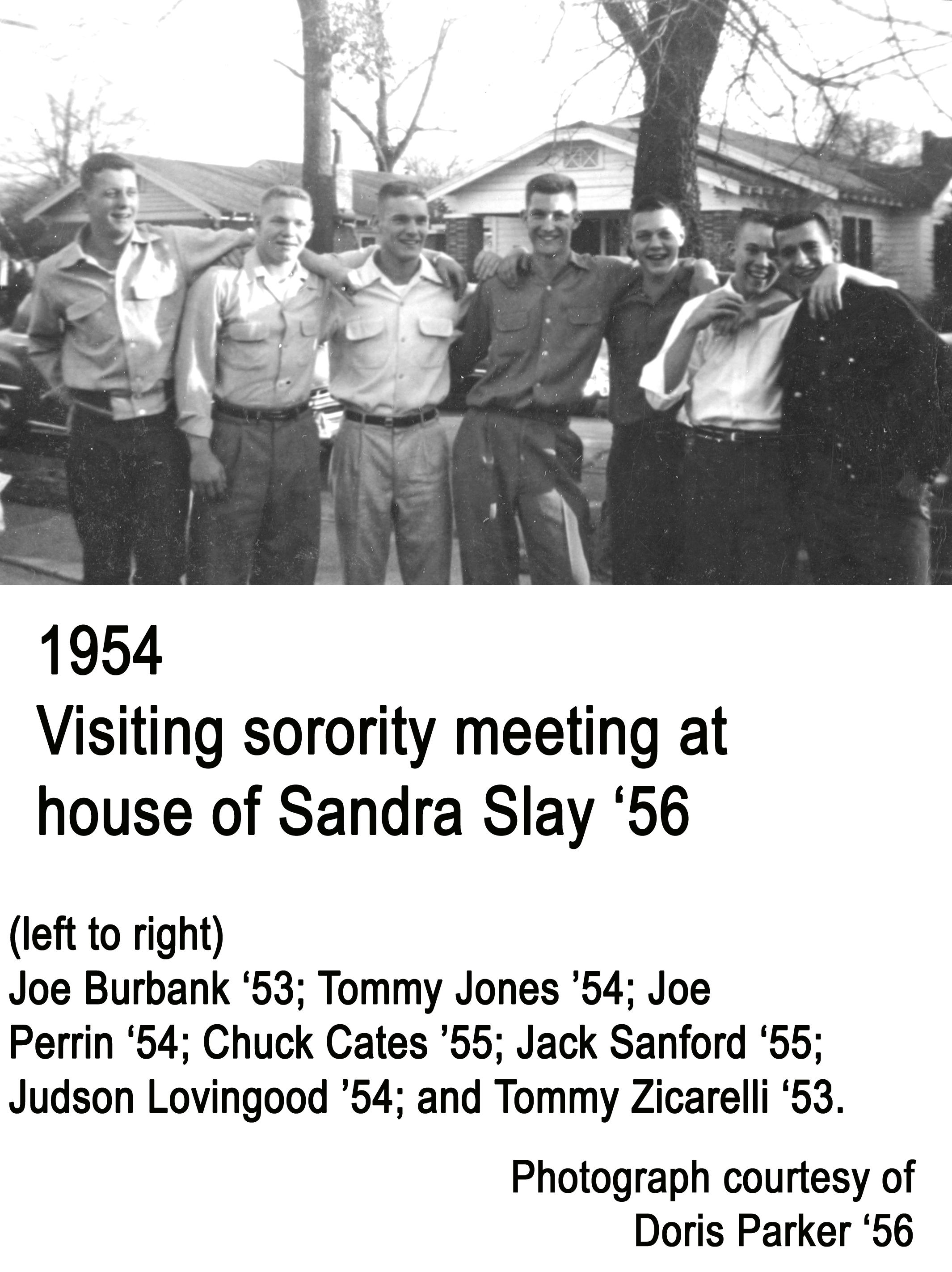 - Visiting site of Delta Phi Delta Sorority meeting: Joe Burbank ’53; Tommy Jones ’54; Joe Perrin ’54; Chuck Cates ’55; Jack Sanford ’55; Judson Lovingood ’54; and Tommy Zicarelli ’53