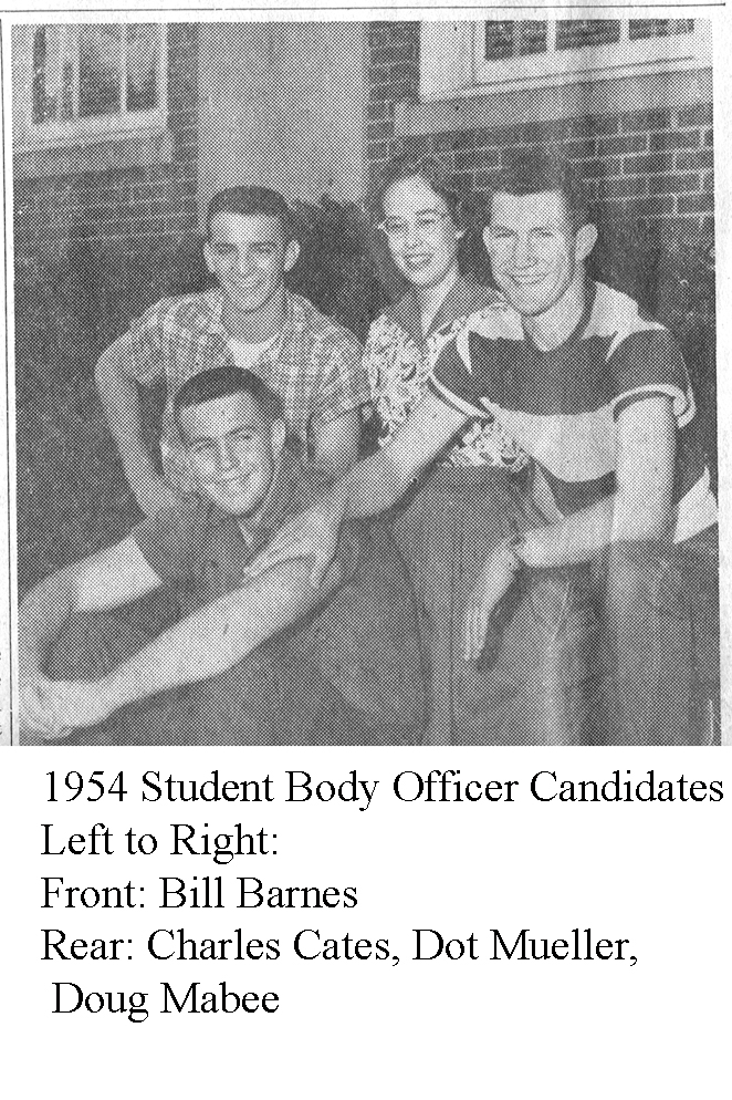 - Student Body Officer Candidates, One: Bill Barnes, Charles Cates, Doug Mabee, and Dorothy Mueller
