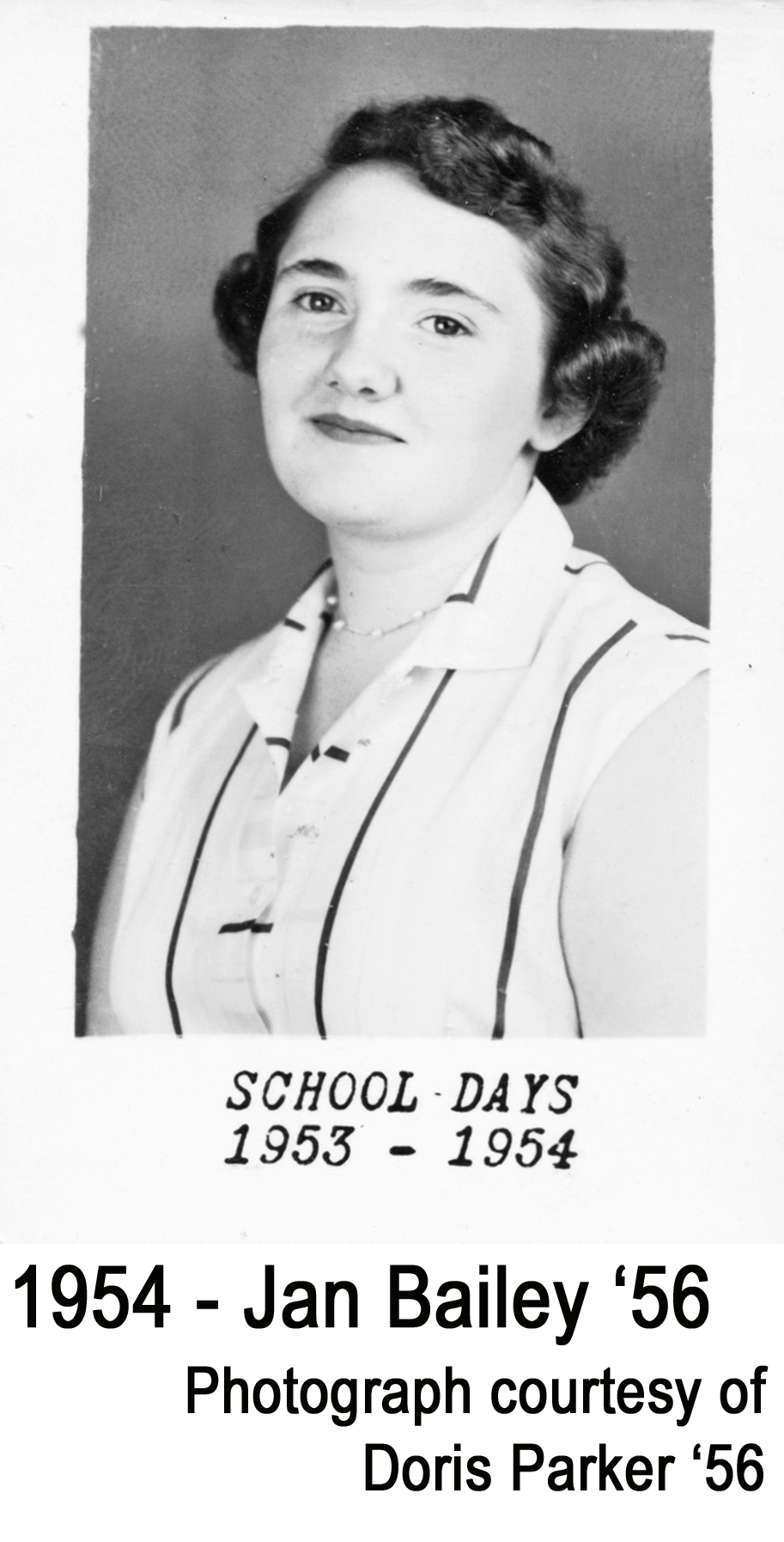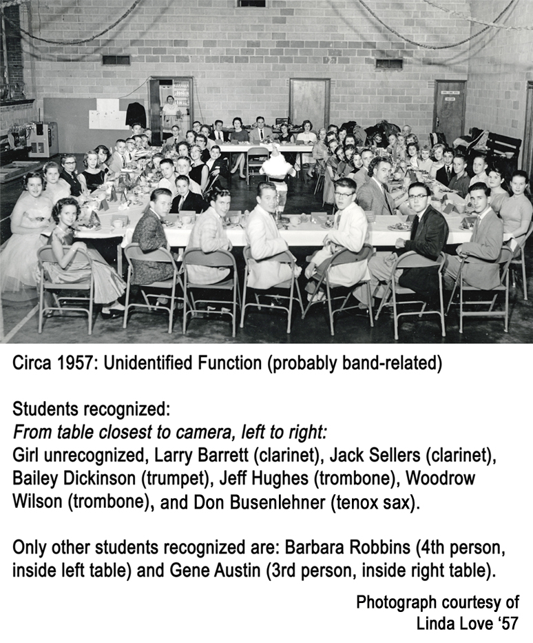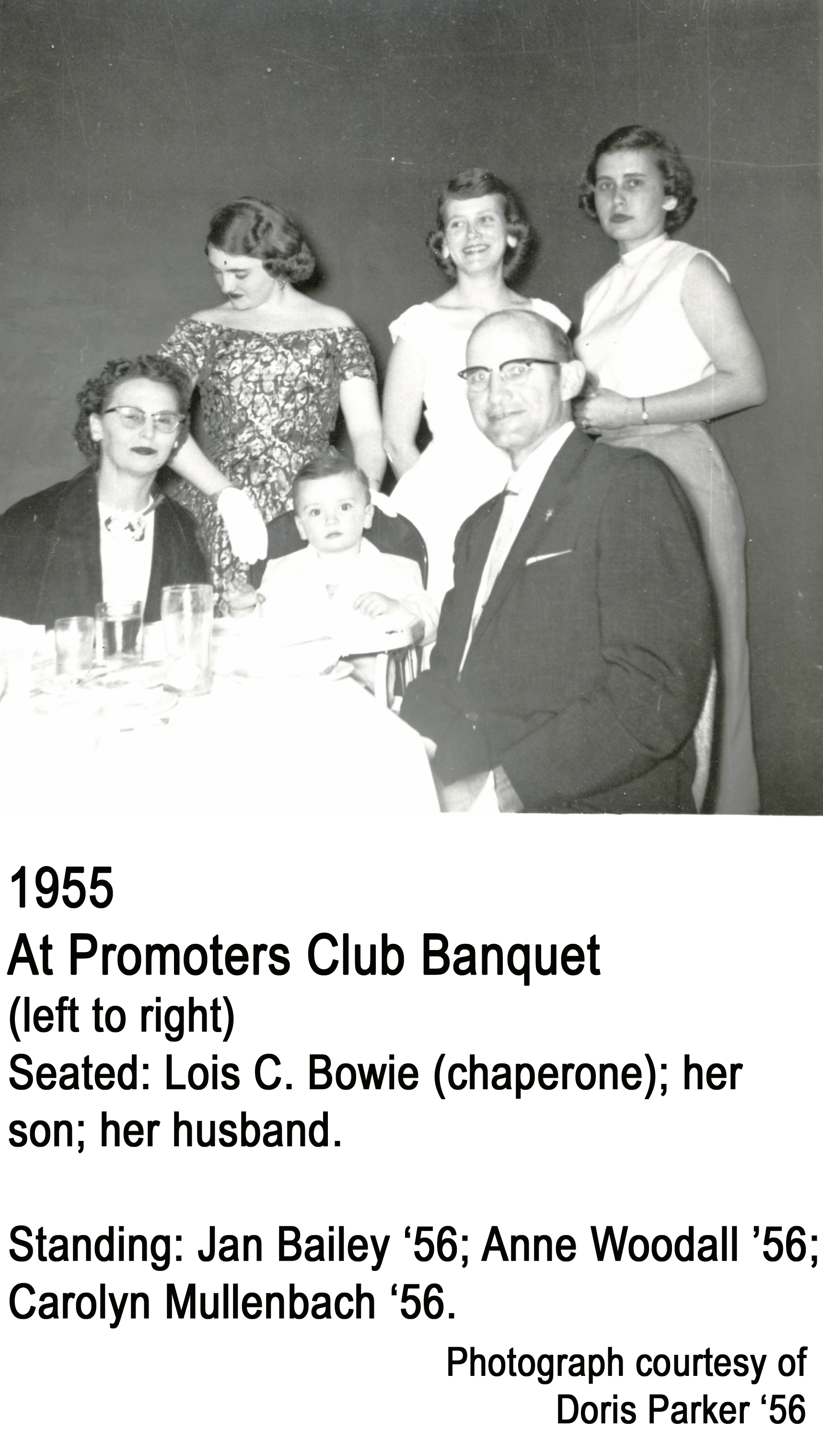- At Promoters Club Banquet: Lois C. Bowie (teacher-chaperone); Bowie son and husband; Jan Bailey ’56; Anne Woodall ’56; and Carolyn Mullenbach ’56