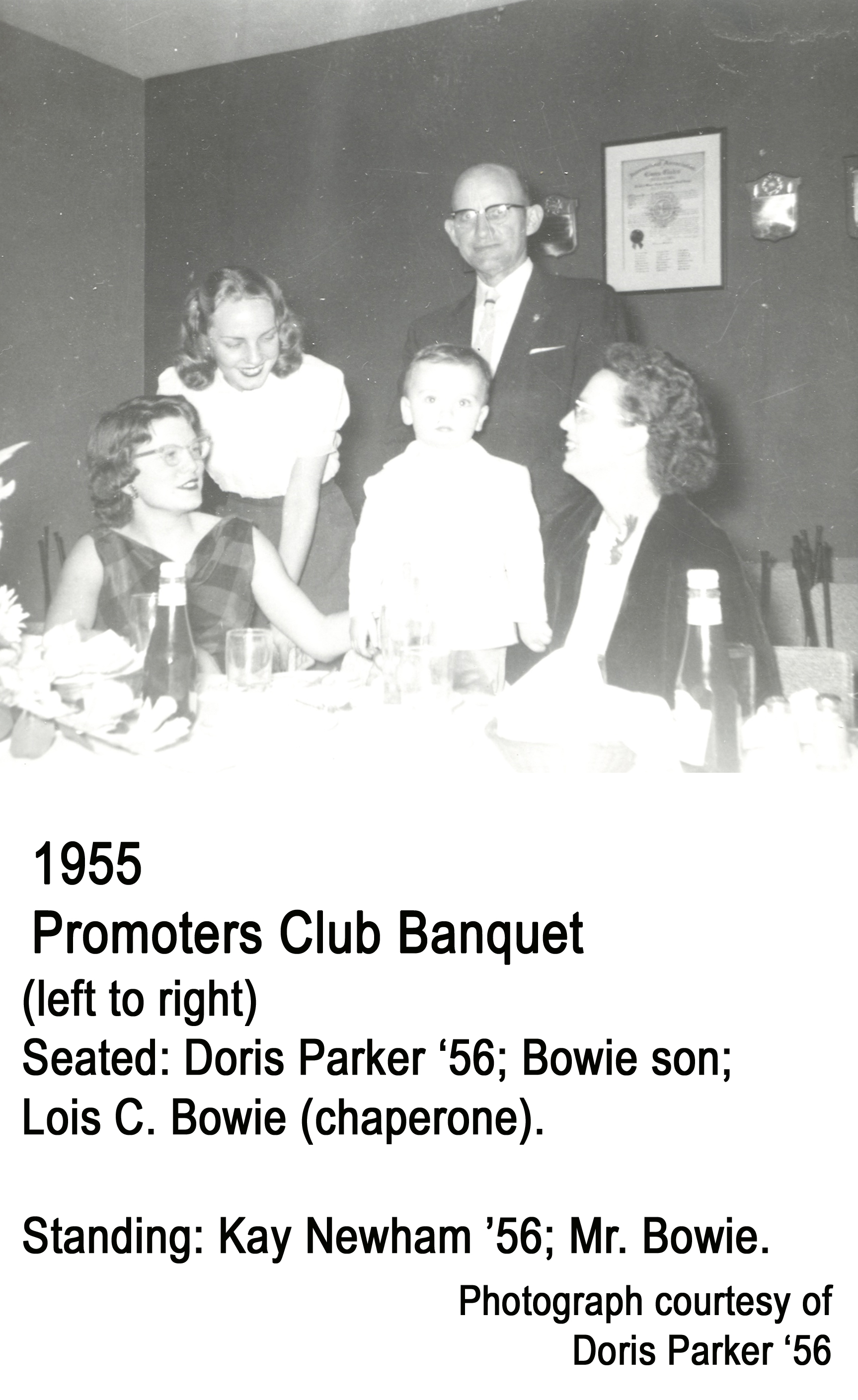 - At Promoters Club Banquet: Doris Parker ’56; Lois C. Bowie (teacher-chaperone); Bowie son and husband; and Kay Newham ’56