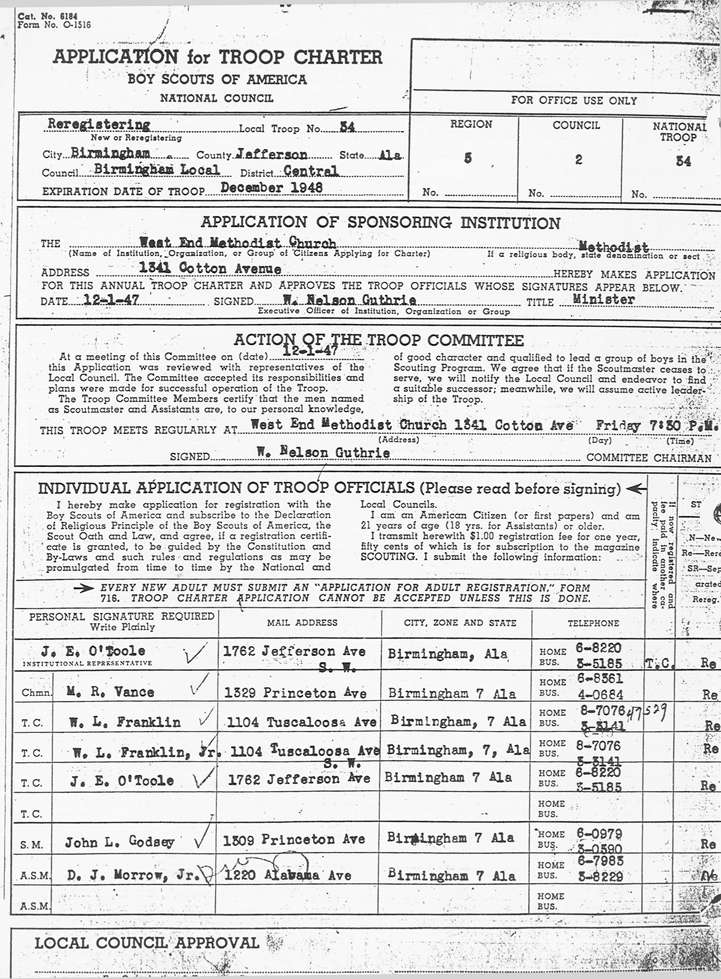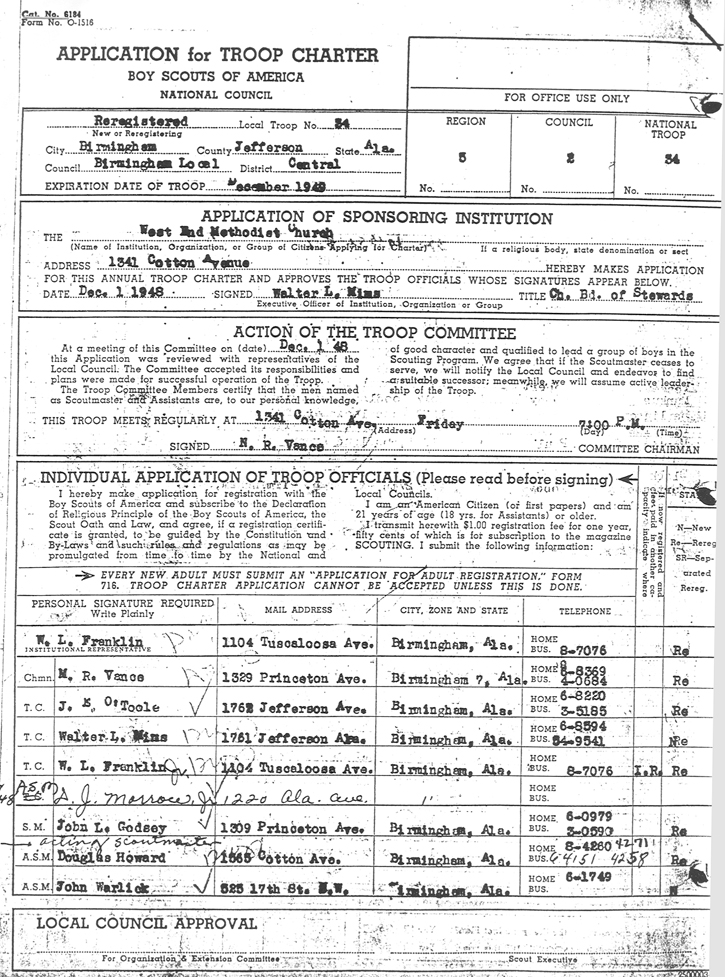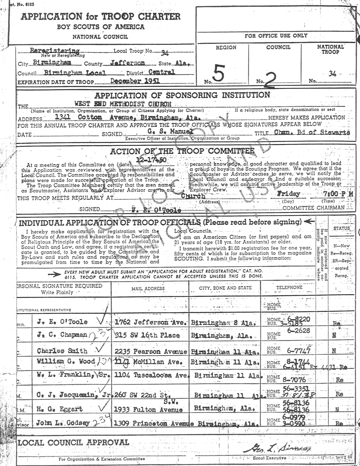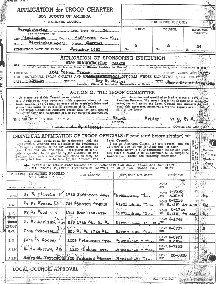 Application for Troop Charter – Troop No. 34 (West End Methodist Church)