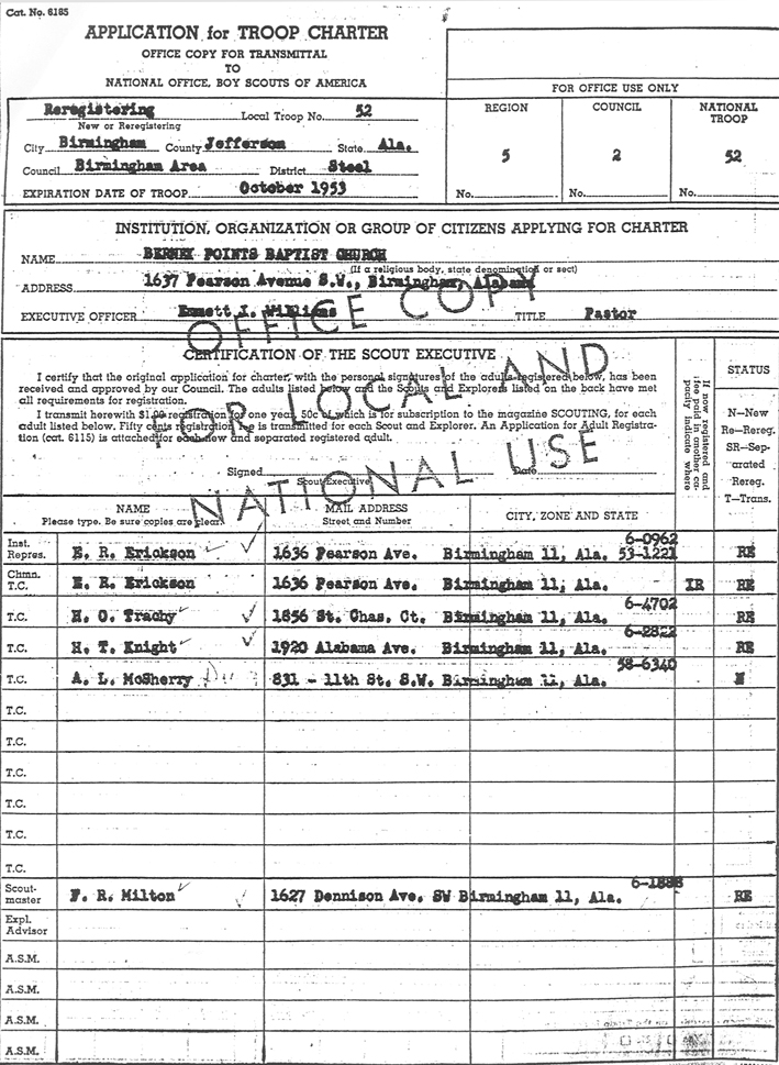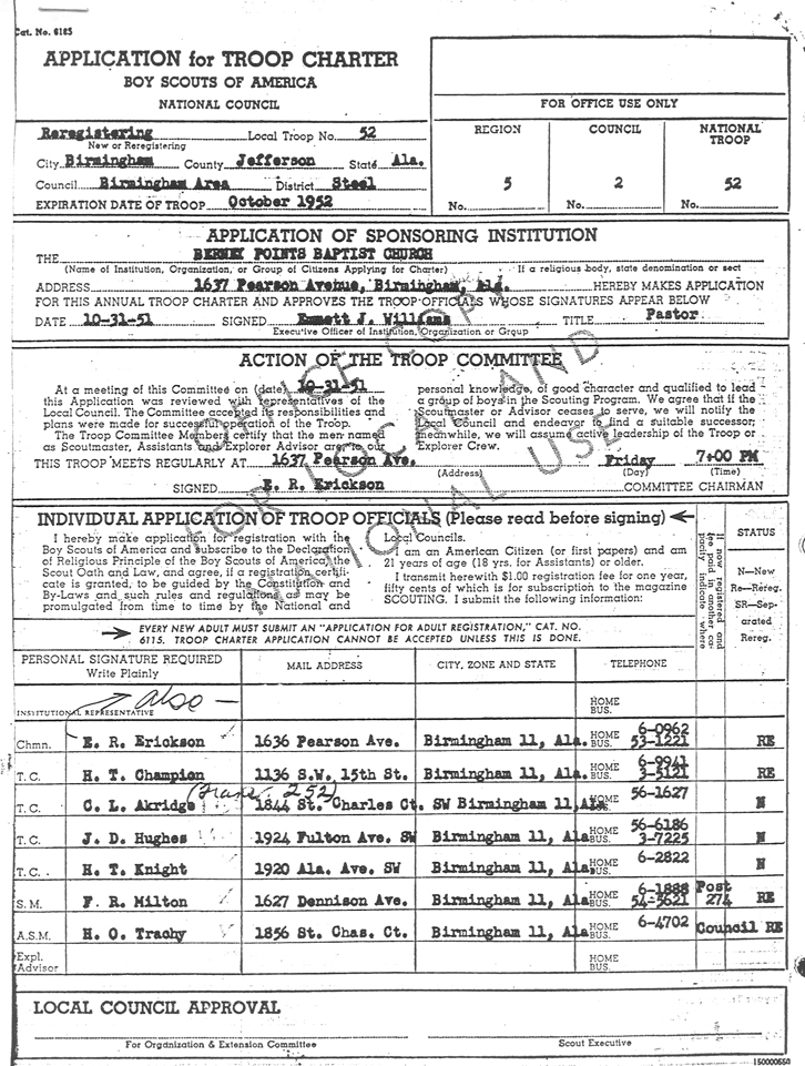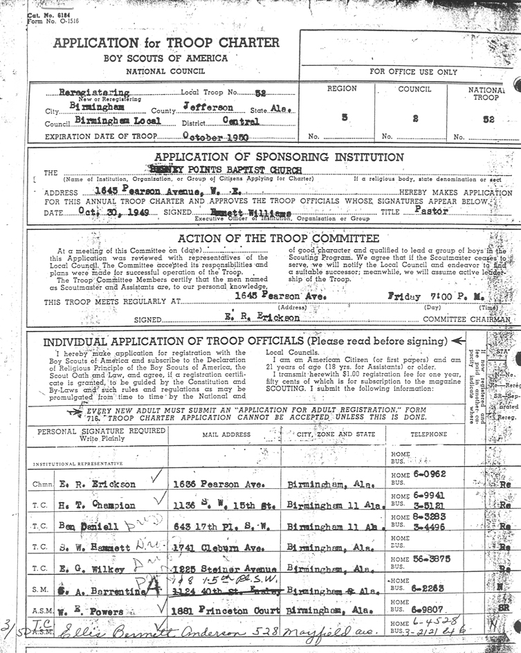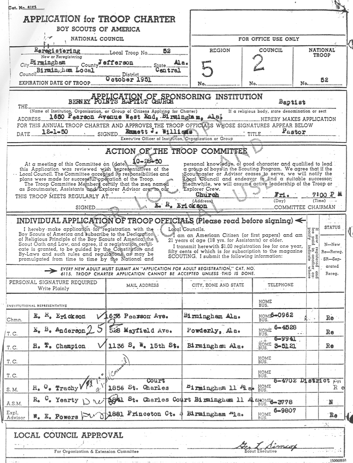 Application for Troop Charter – Troop No. 52 (Berney Points Baptist Church)