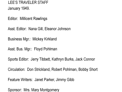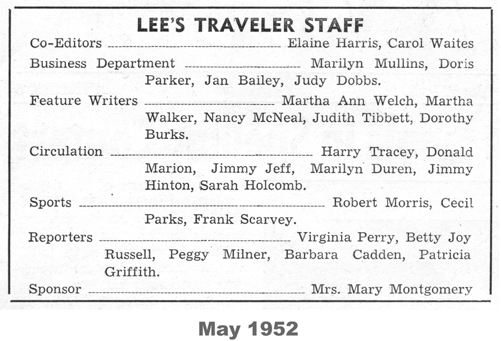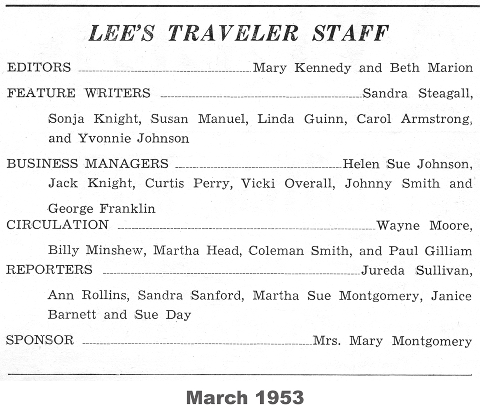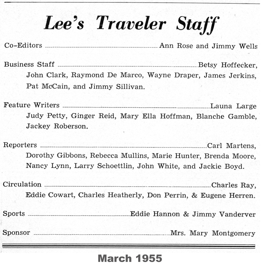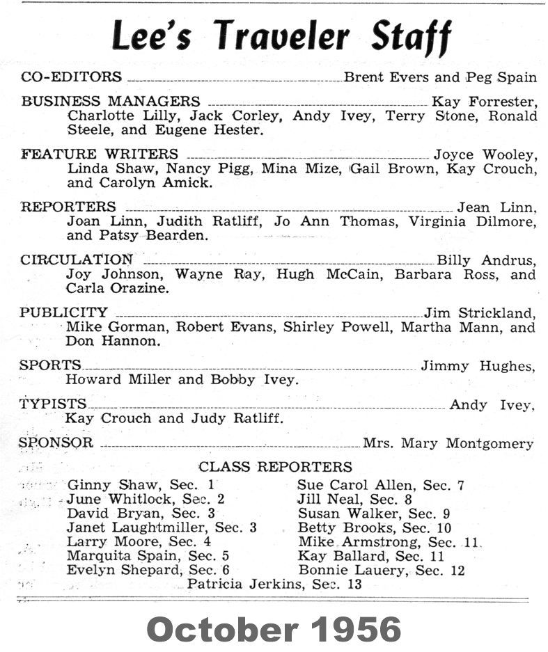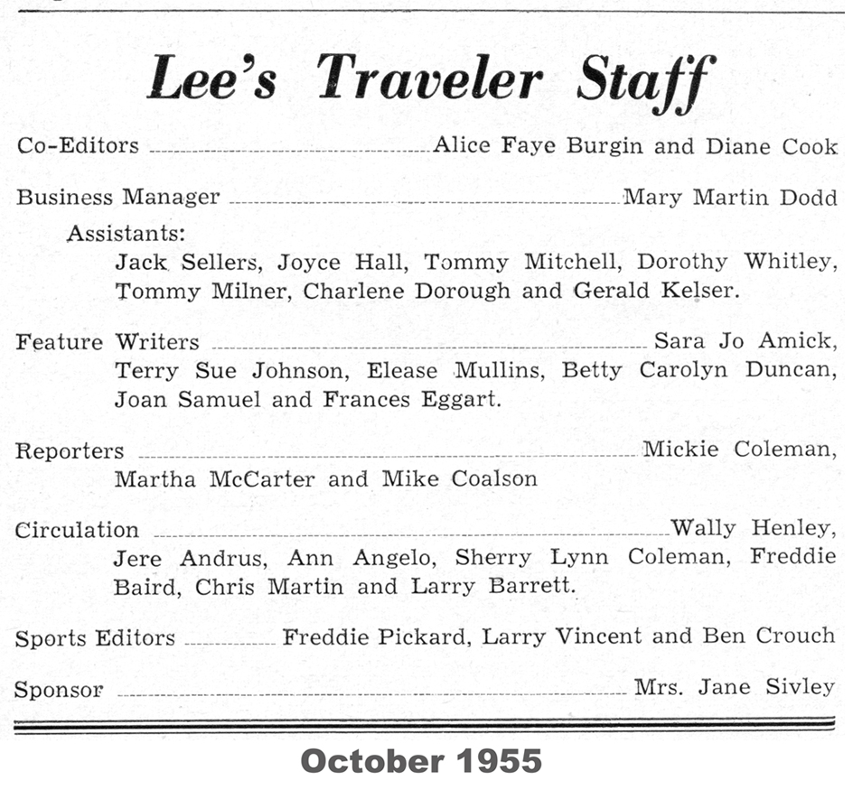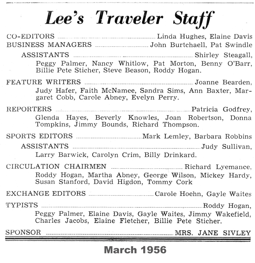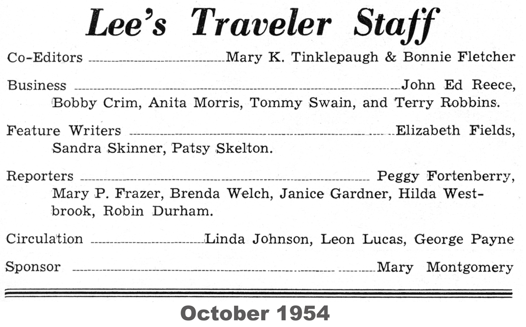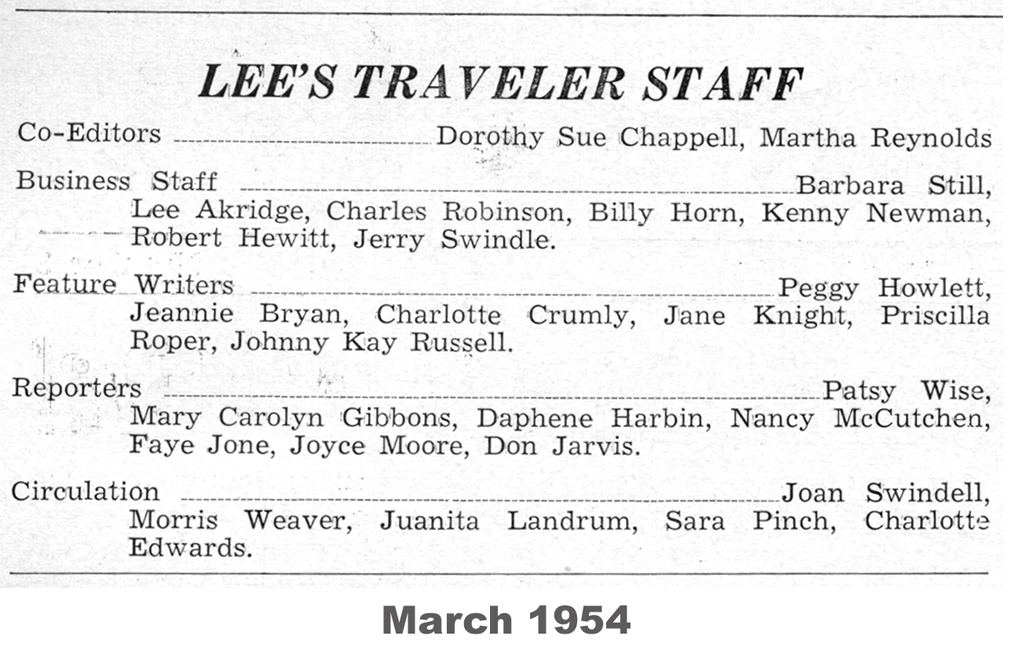 The following material was extracted from copies of the Robert E. Lee school newspaper, Lee’s Traveler, provided by Bruce Howard ’58.