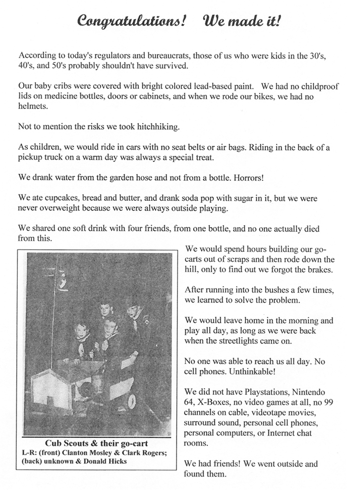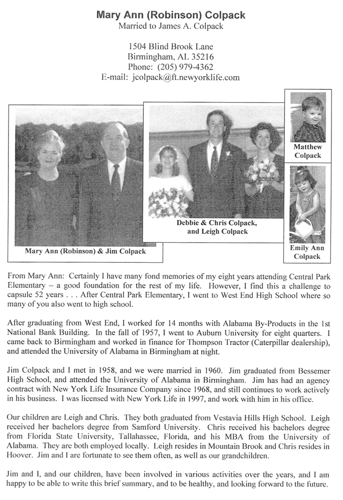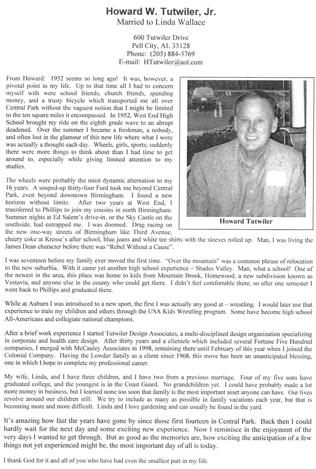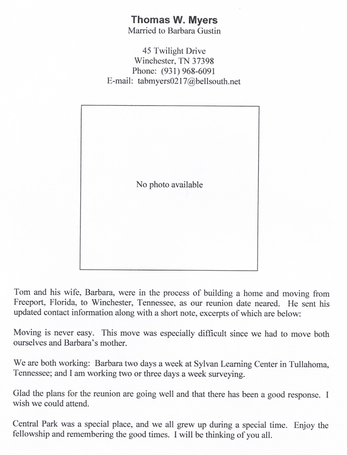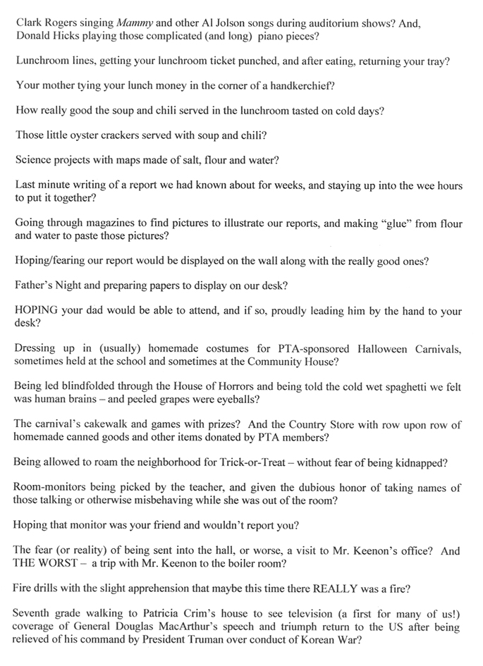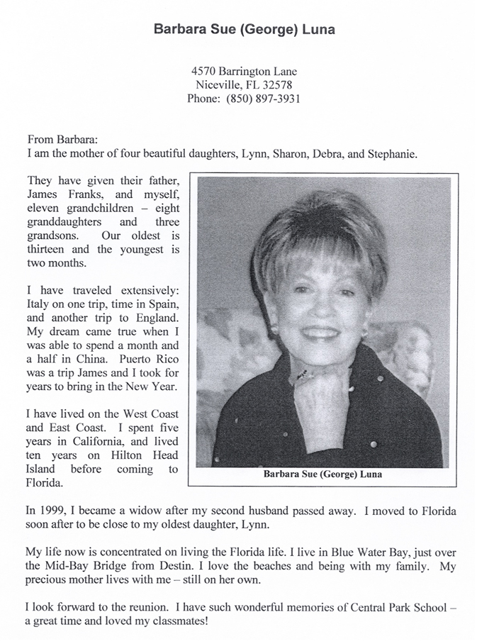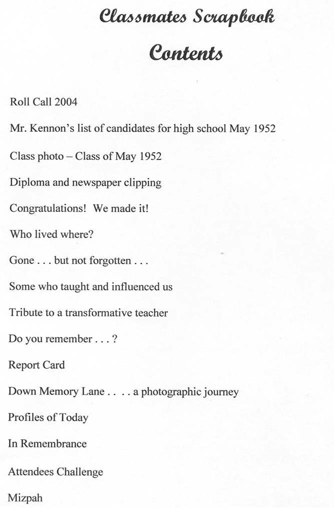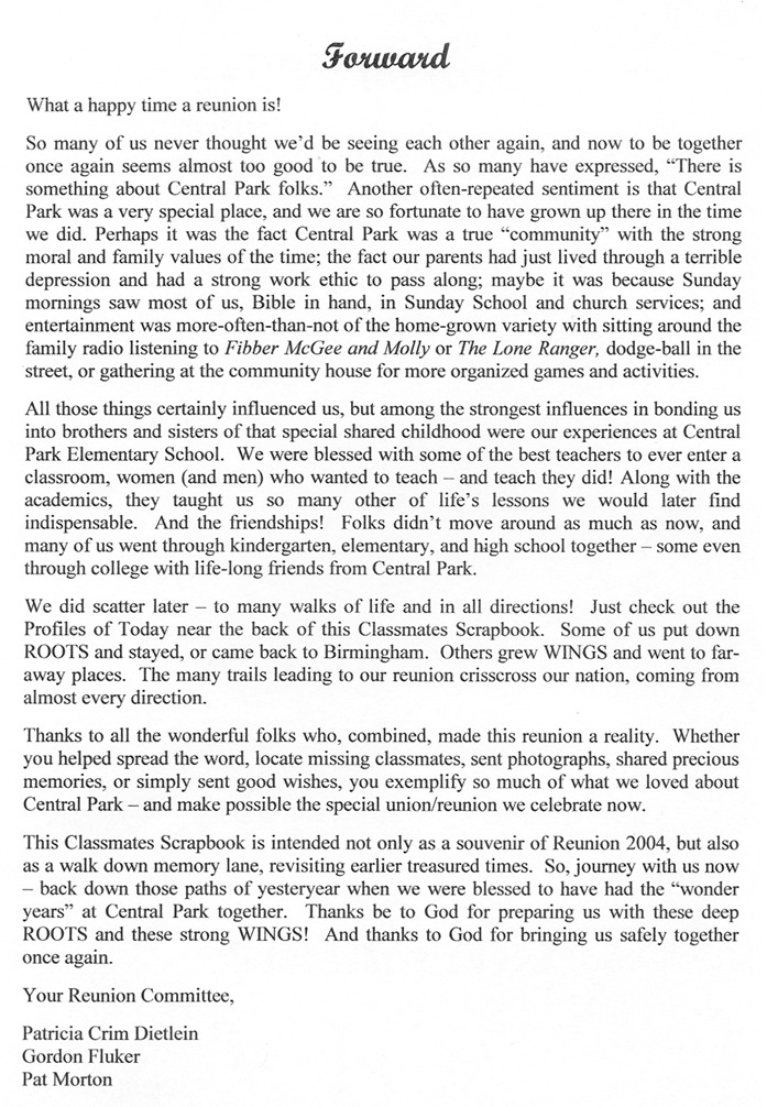 Herewith is the impressive Scrapbook created for the 2004 Reunion of the Class of May 1952 of Central Park Elementary School. The Scrapbook was provided by Bruce Howard ’58 and scanned by Linda Love ’57.
