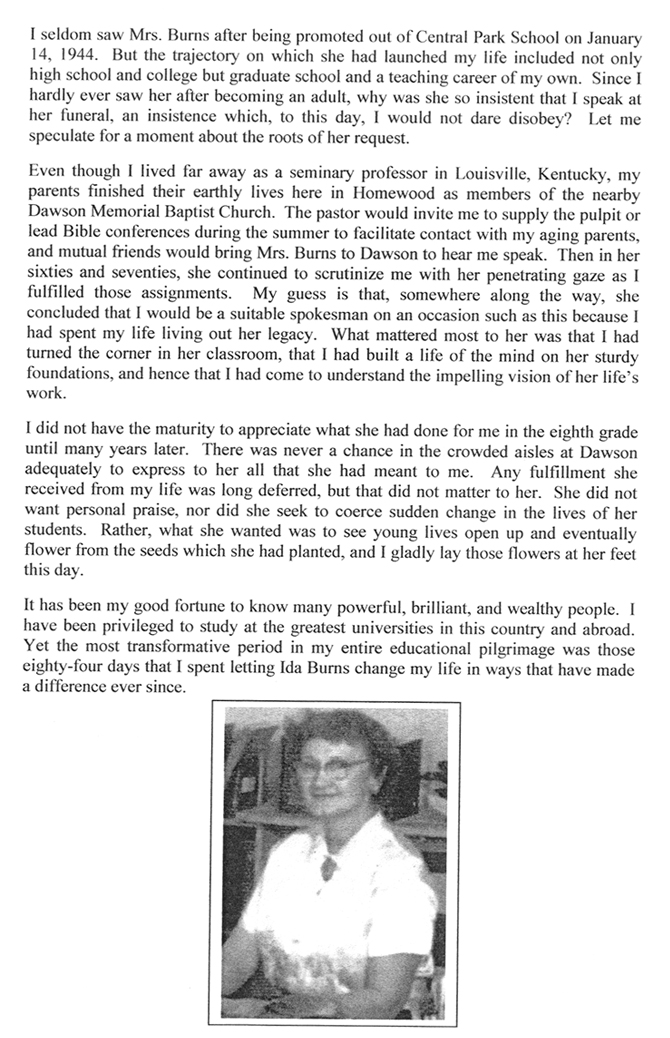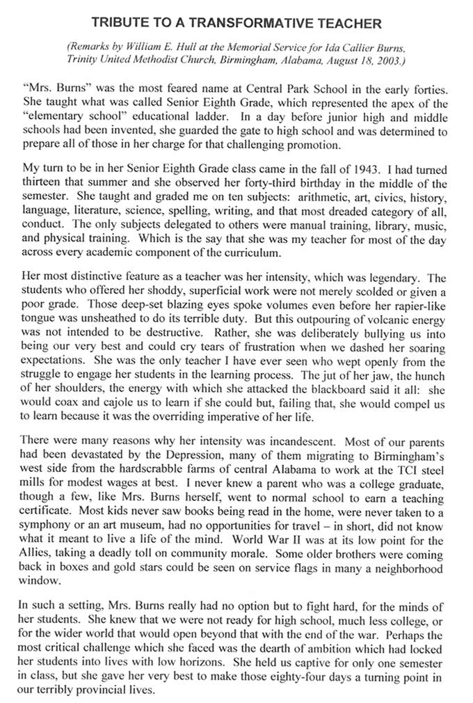 TRIBUTE TO A TRANSFORMATIVE TEACHER: IDA CALLIER BURNS