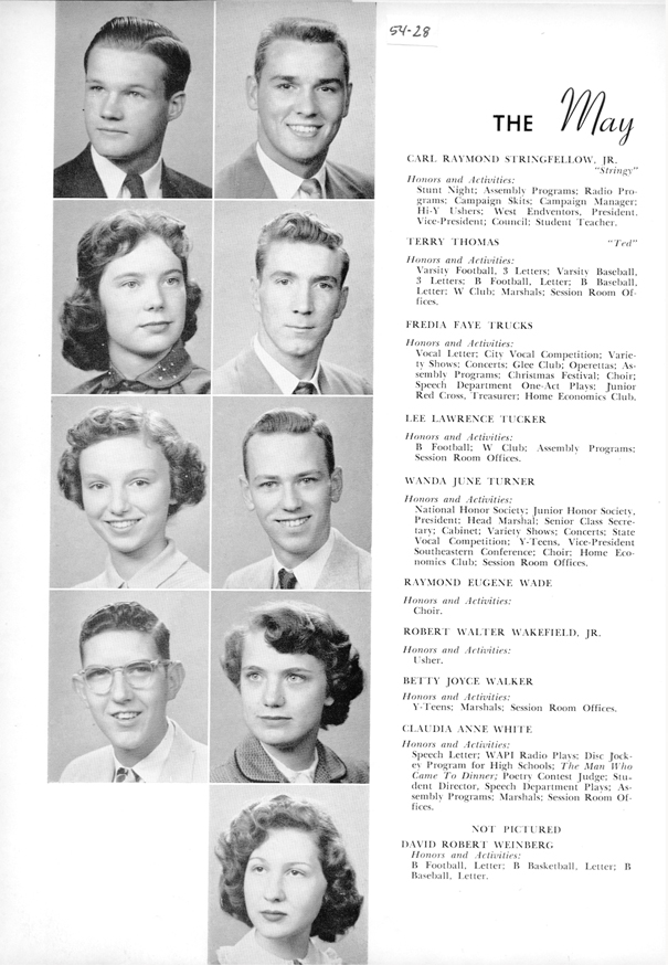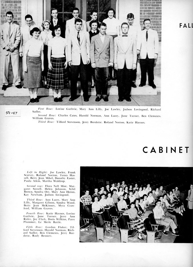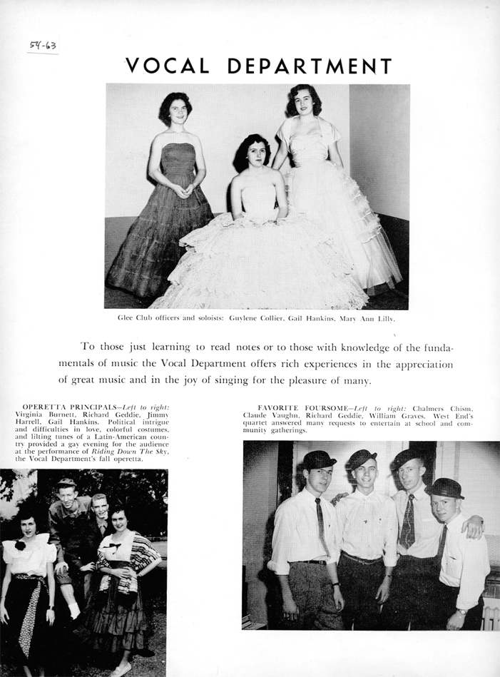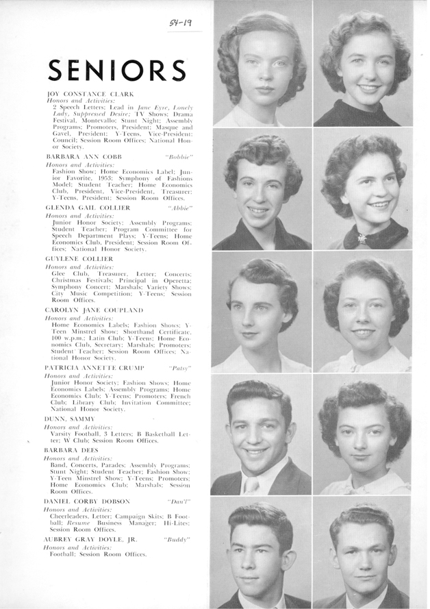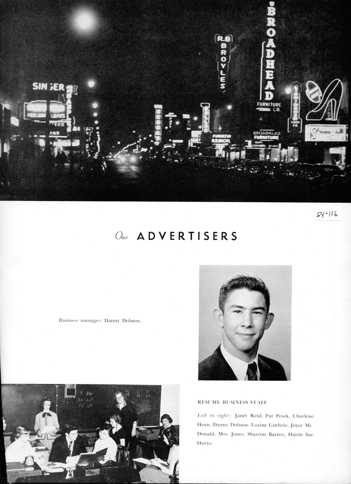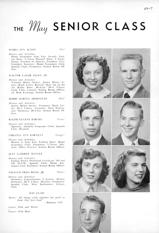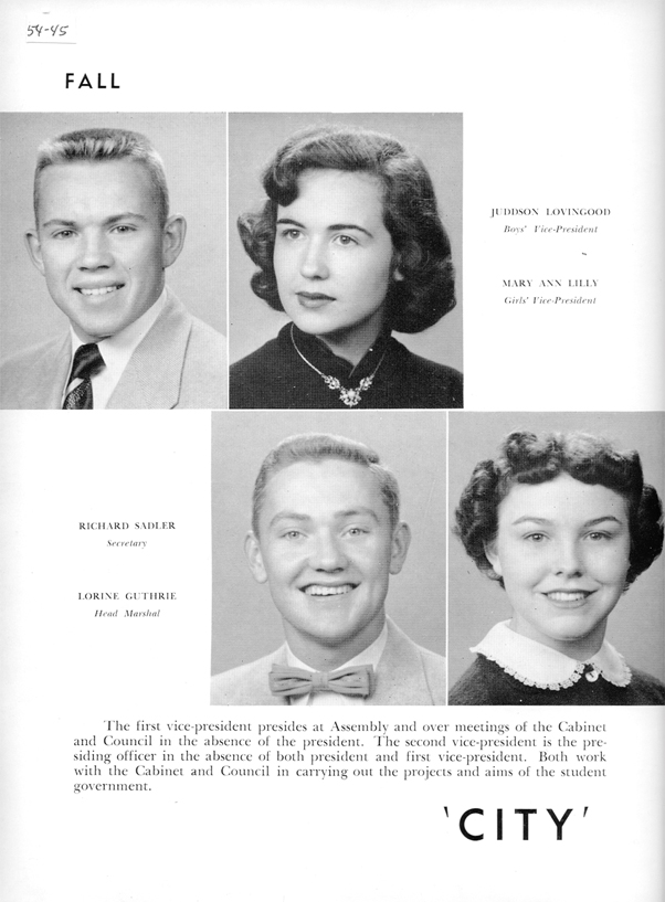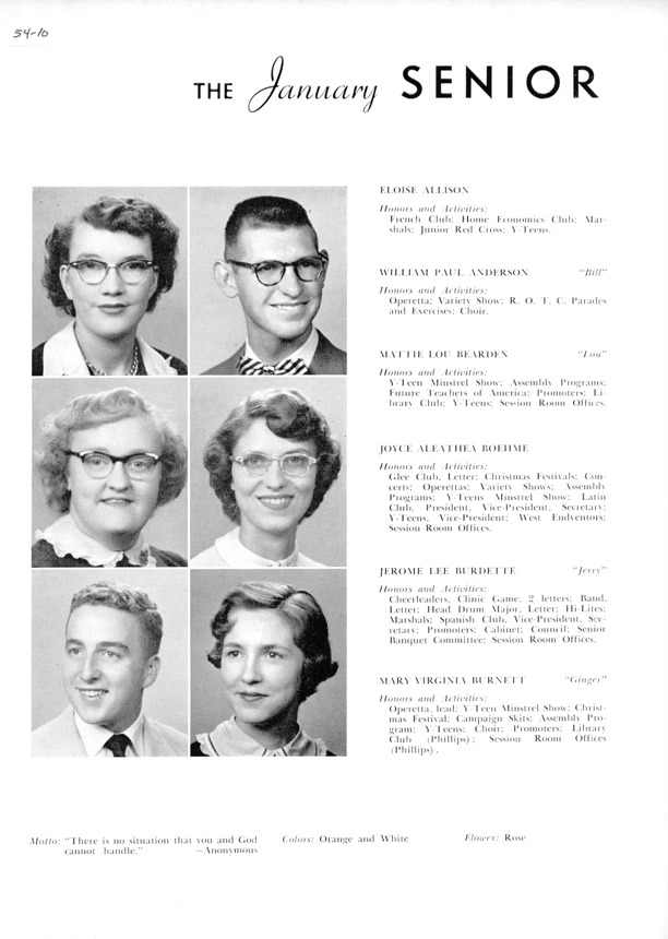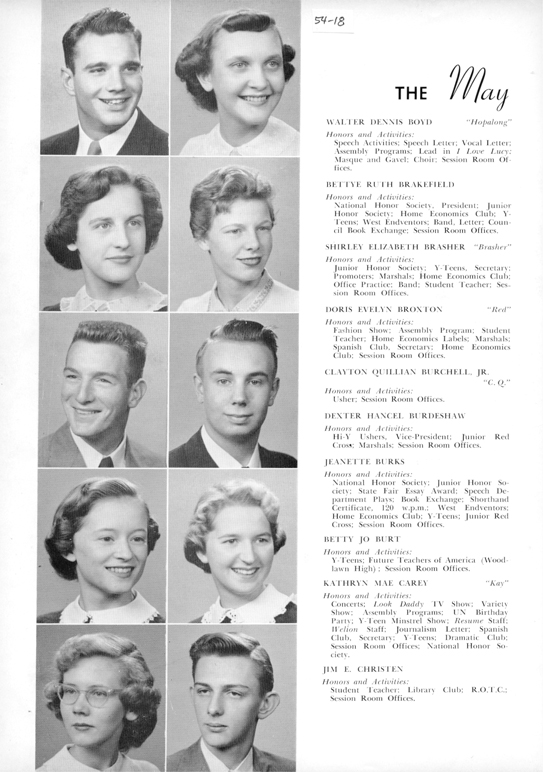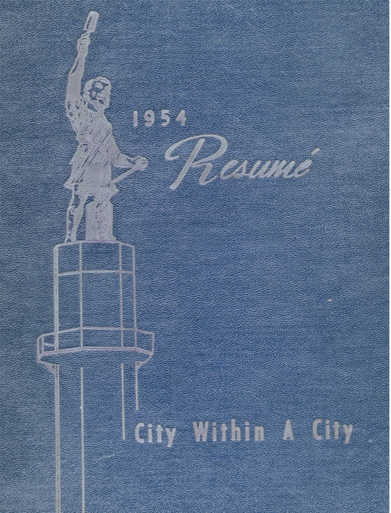 The contents of the 1954 Resume are listed below. To see any page, just click the link and the image will open in a new window. This is the Resume of Billy Godwin ’56, courtesy of Bruce Howard ’58, with scans by Linda Love ’57.