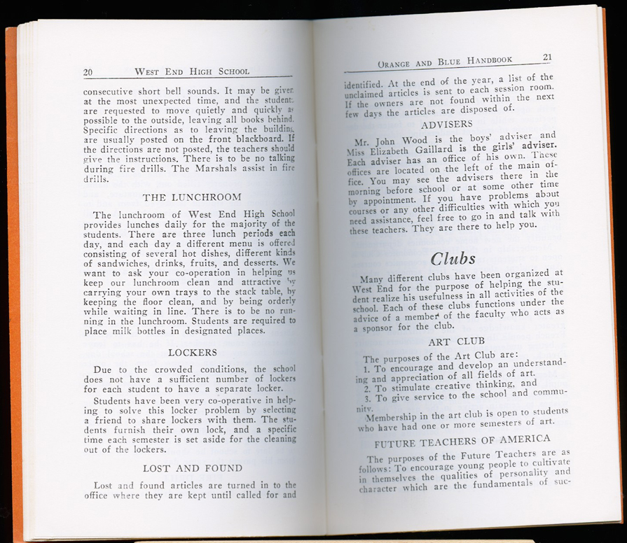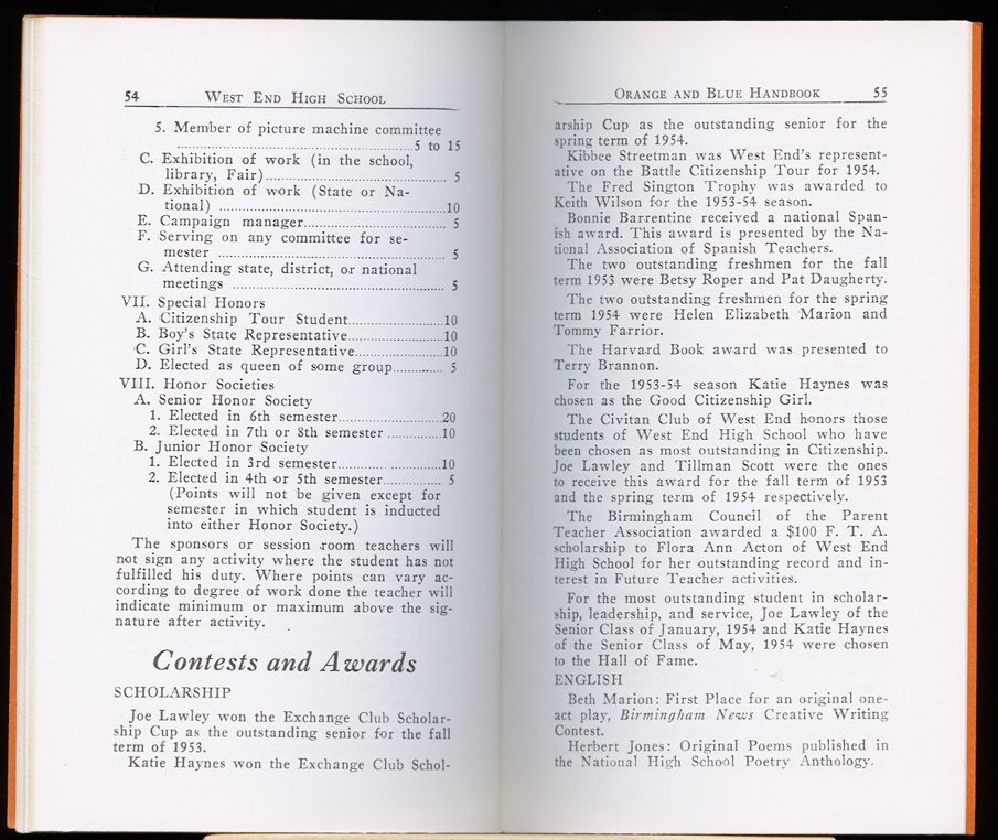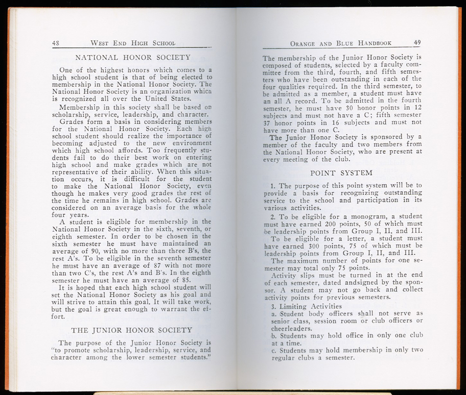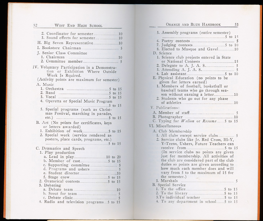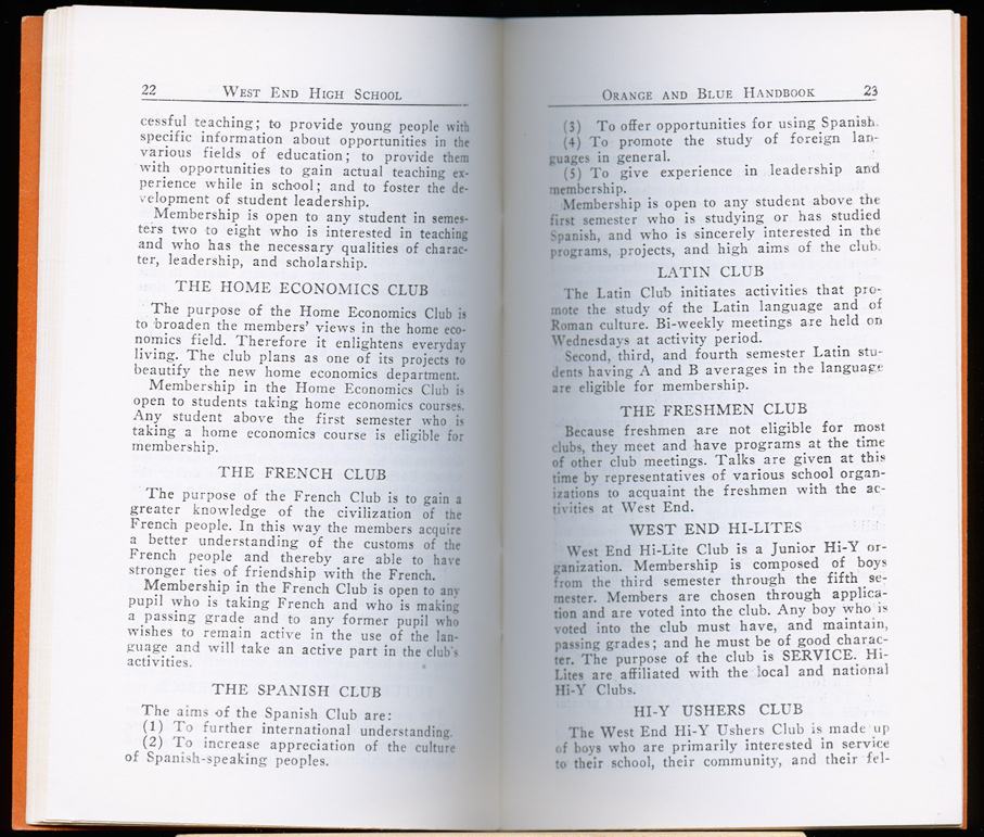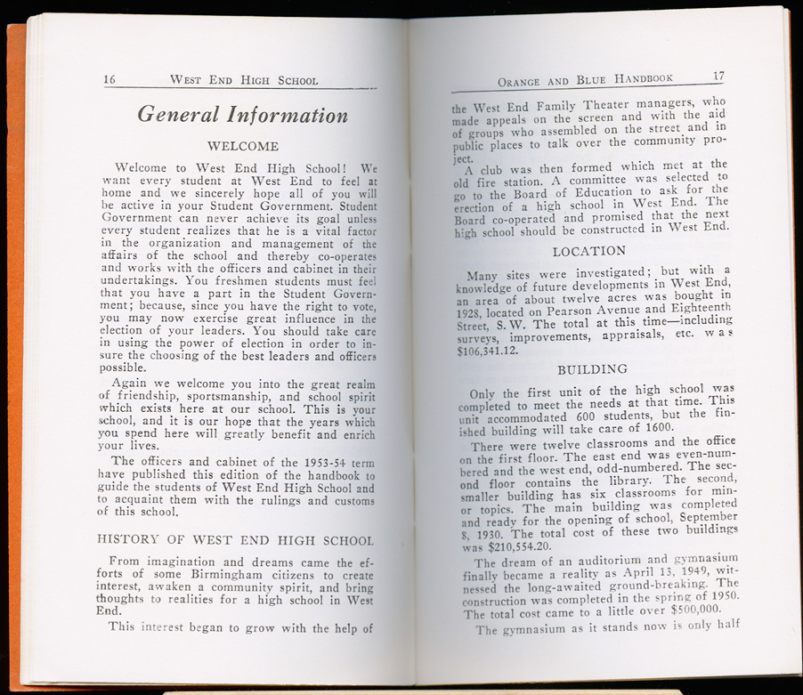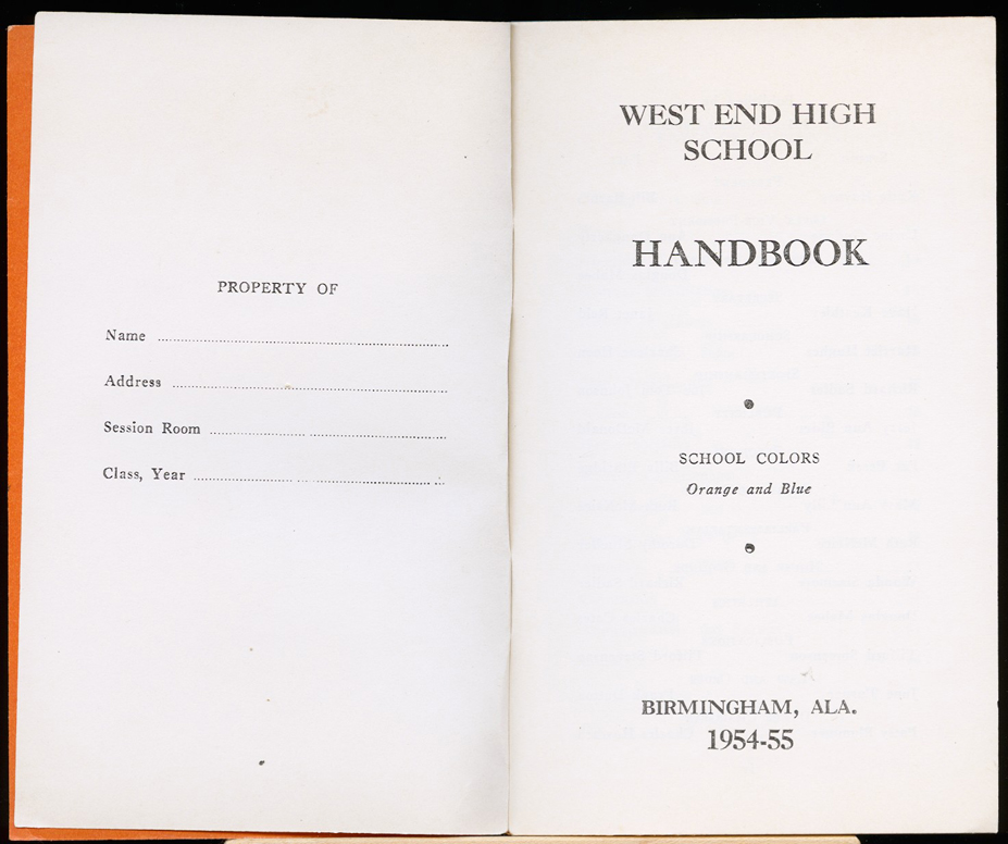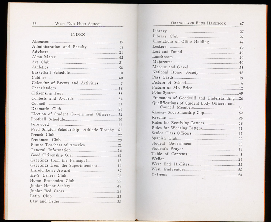Below are the contents of the 1954-55 Handbook for West End High School. Handbook courtesy of Bruce Howard ’58, scans by Linda Love ’57.