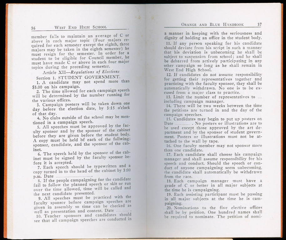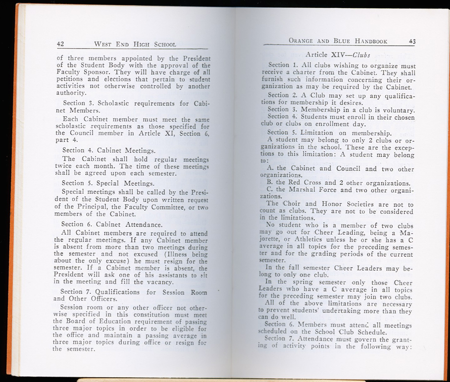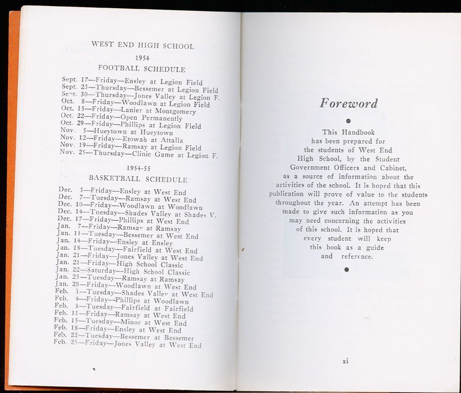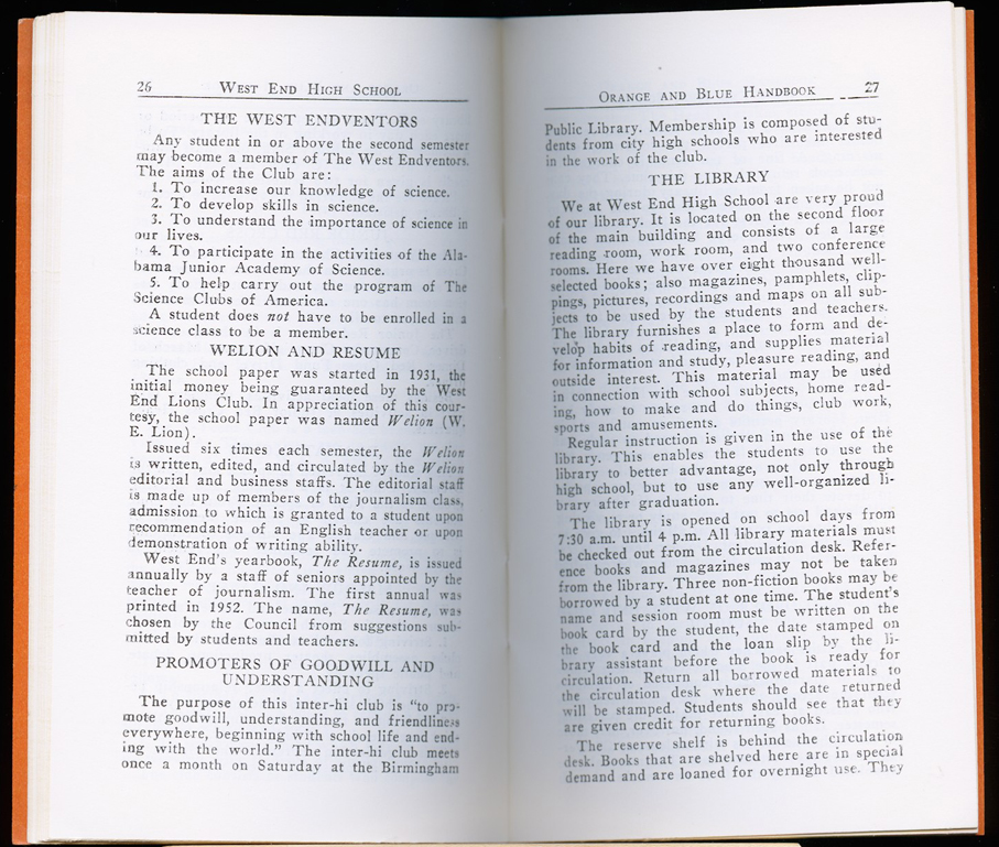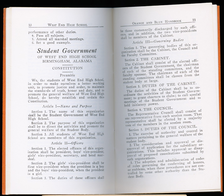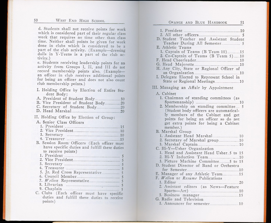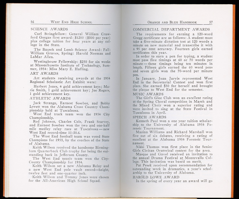 Below are the contents of the 1954-55 Handbook for West End High School. Handbook courtesy of Bruce Howard ’58, scans by Linda Love ’57.