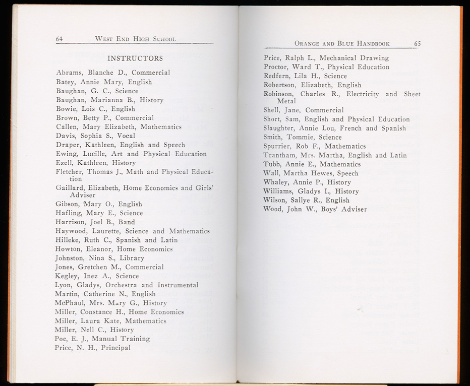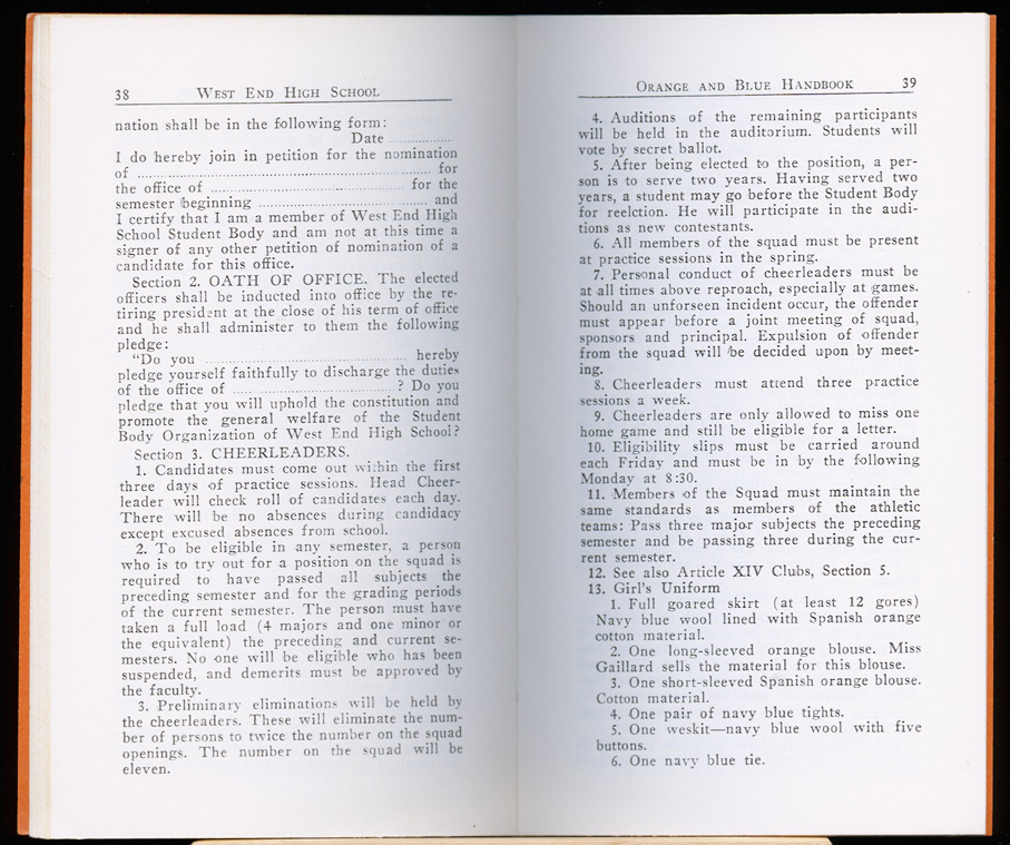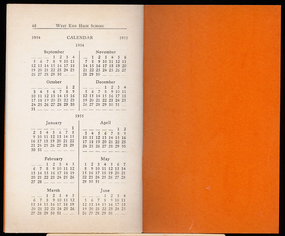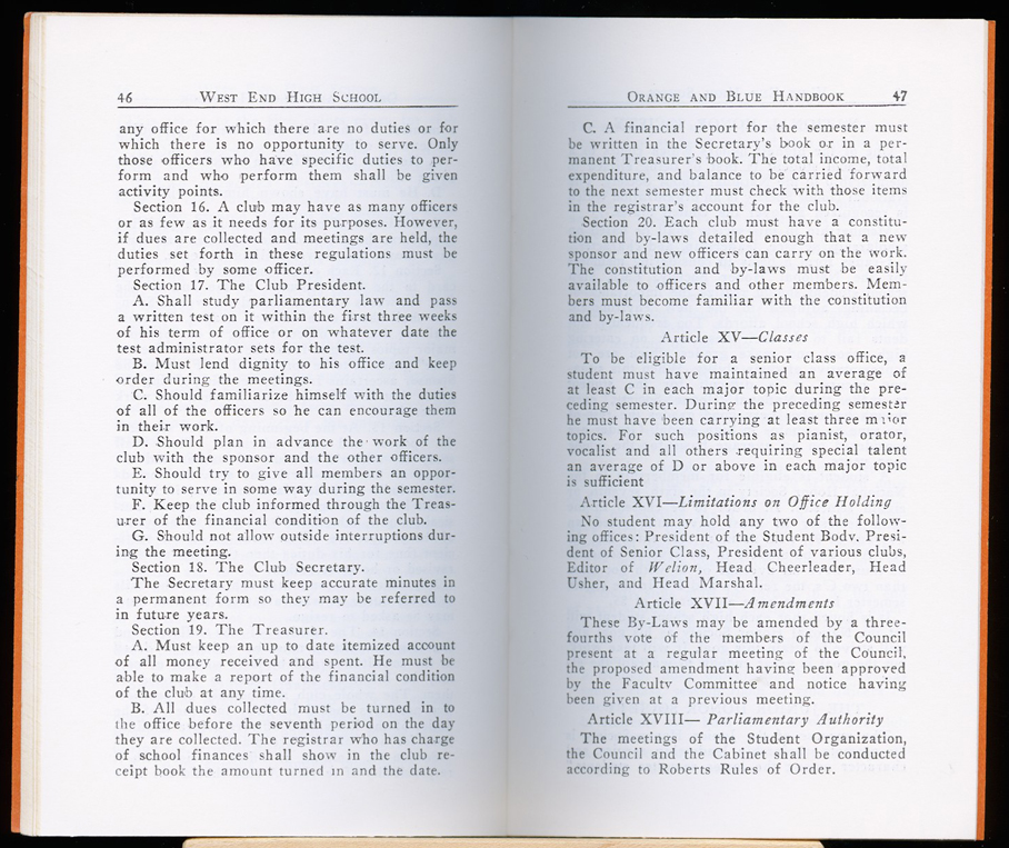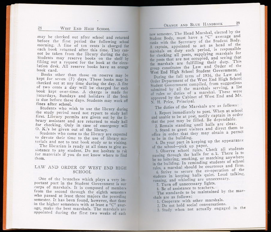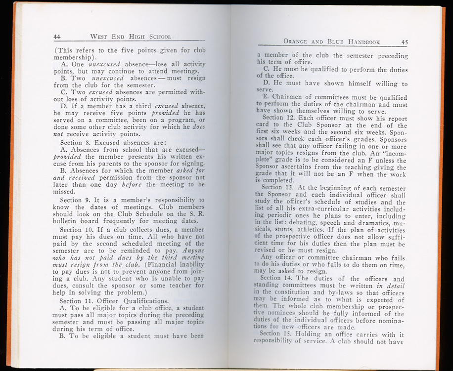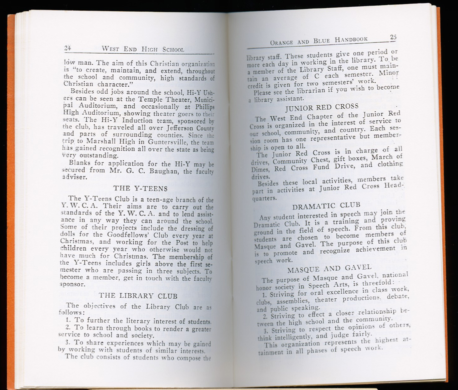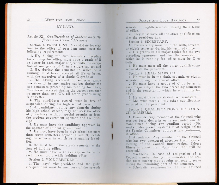 Below are the contents of the 1954-55 Handbook for West End High School. Handbook courtesy of Bruce Howard ’58, scans by Linda Love ’57.