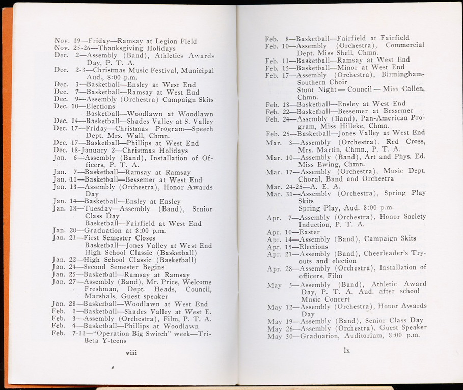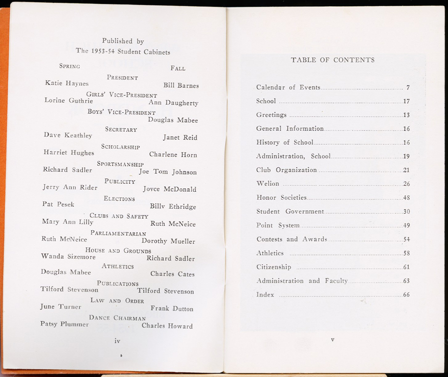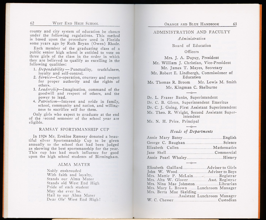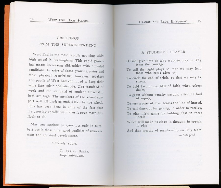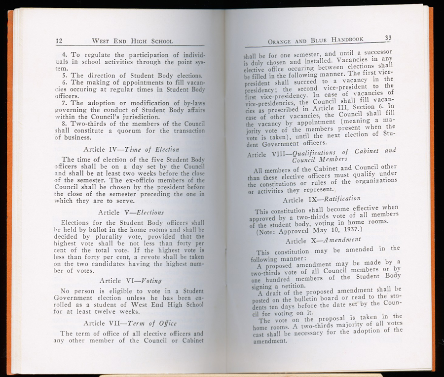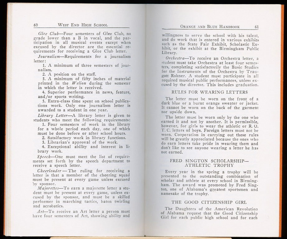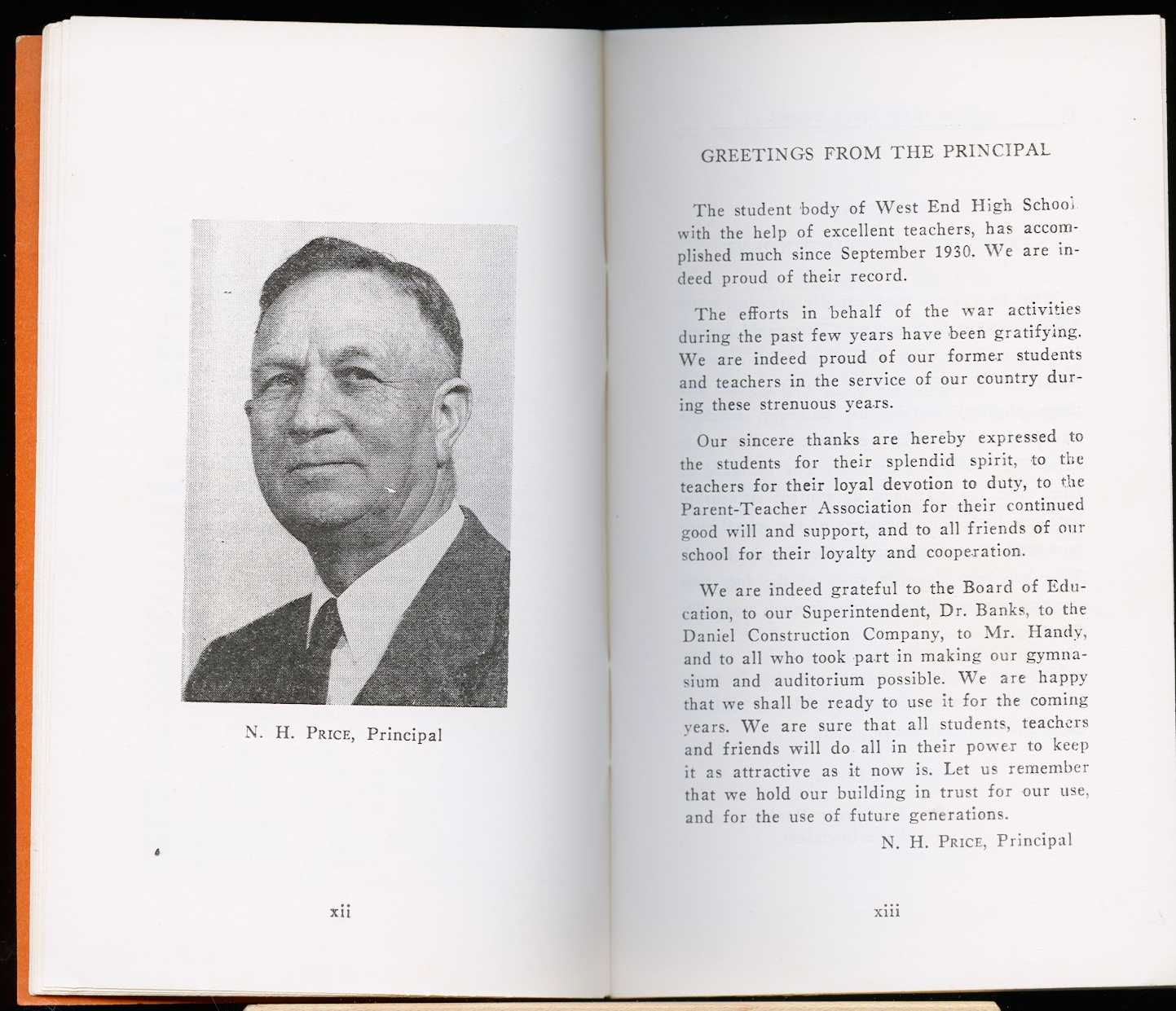 Below are the contents of the 1954-55 Handbook for West End High School. Handbook courtesy of Bruce Howard ’58, scans by Linda Love ’57.