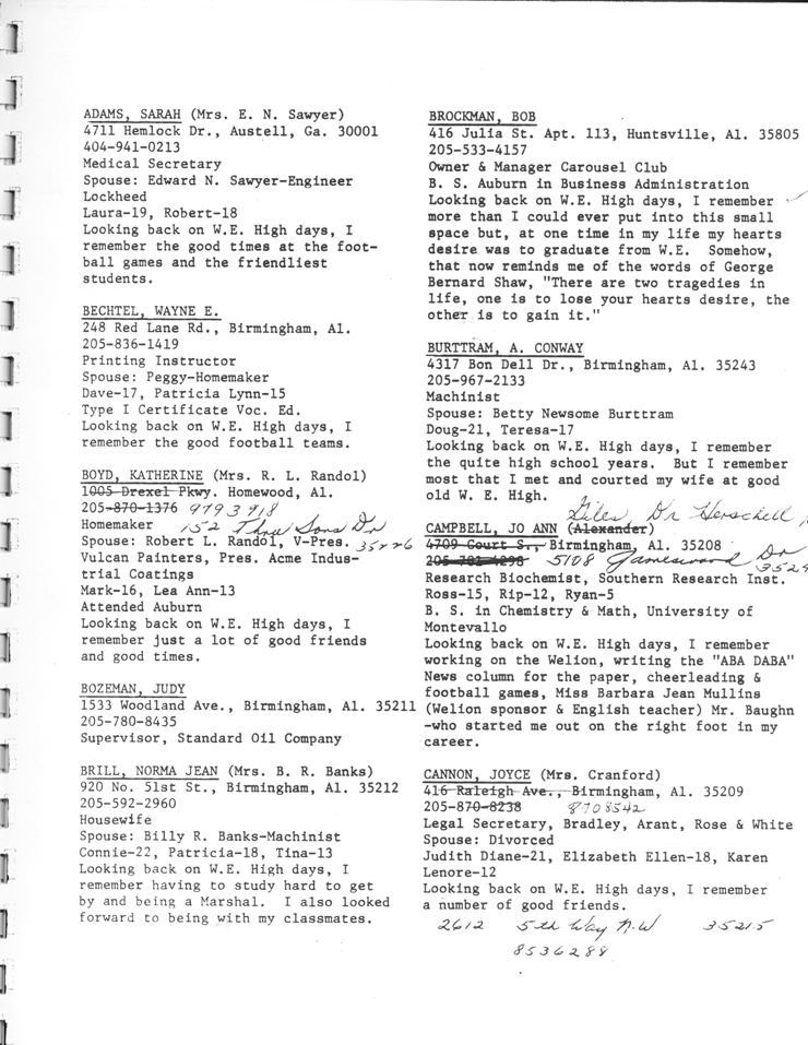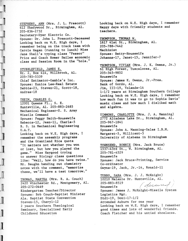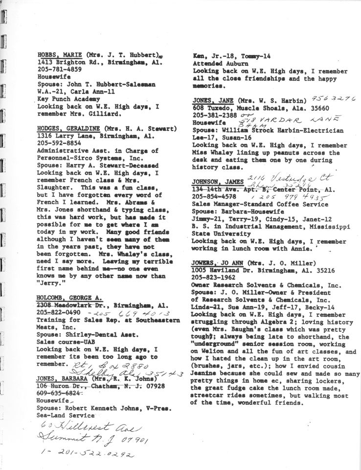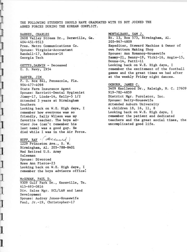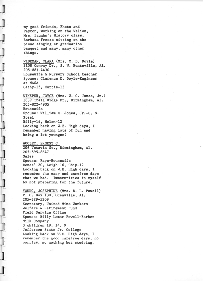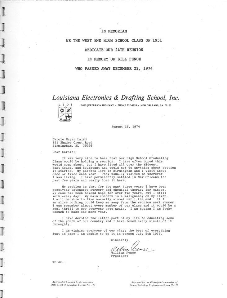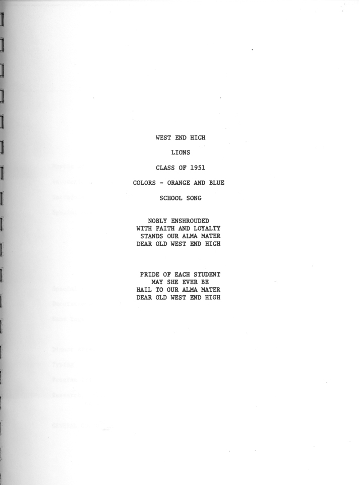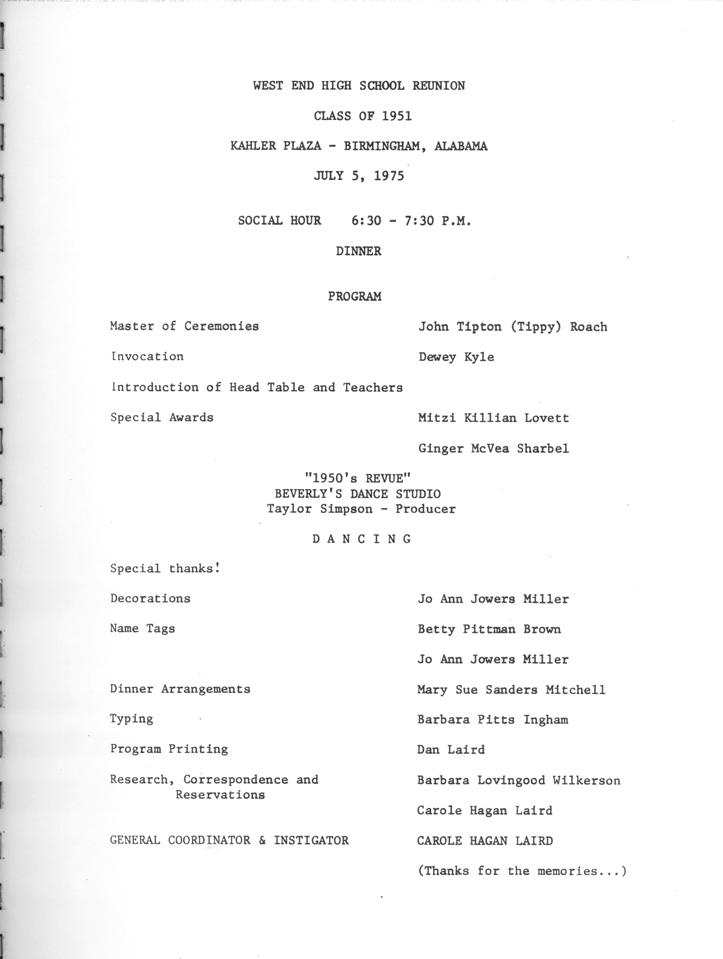 Below are the contents of the Program issued at the time of the July 5, 1975, reunion of the WEHS Class of 1951 at Kahler Plaza in Birmingham, Alabama. Program provided by Bruce Howard ’58, scans by Linda Love ’57.