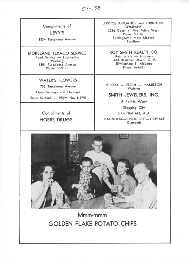 - Students eating Golden Flake Potato Chips (Sandra Steagall, Charles McGee, Wally Henley, Linda Love, Robert Stonecypher) (57-138)