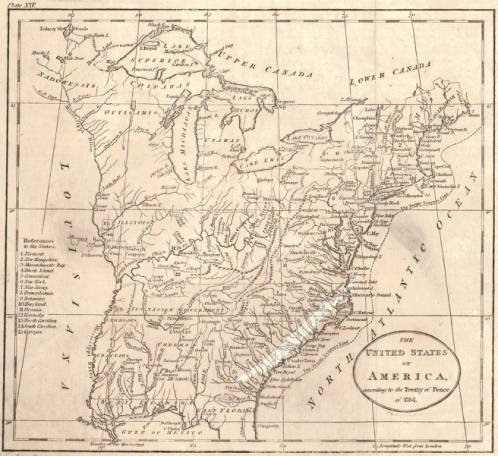 This is an early map of the United States following the American Revolution which was formally ended with the signing of the Treaty of Paris. The treaty was signed on September 3, 1783, and ratified by the United States on Janaury 14, 1784. Lands set aside for military veterans are indicated as are the locations of various tribes of Native Americans. The area that would become Alabama is, at this point, part of Georgia. Shown on this map is the "Tennessee Government" which refers to the State of Franklin, an area in present-day eastern Tennessee which was established in 1784.