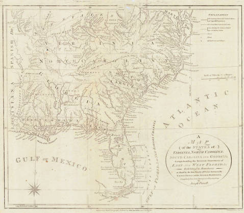 Map of the states of Virginia, North Carolina, South Carolina and Georgia: comprehending the Spanish provinces of east and west Florida: exhibiting the boundaries as fixed by the late treaty of peace between the United States and the Spanish dominions, 1792. Gift of Rucker Agee.
