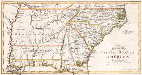 A new and general map of the Southern dominions belonging to the United States of America: viz North Carolina, South Carolina, and Georgia with the bordering Indian countries, and the Spanish possessions of Louisiana and Florida, 1794. Gift of Rucker Agee.