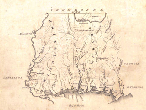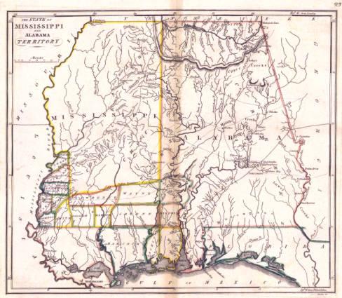 This map from 1818 shows Mississippi as a state and Alabama as a territory. In only one year, Alabama would also join the United States as the 22nd state. Counties are beginning to emerge with Washington and Baldwin being among the first.