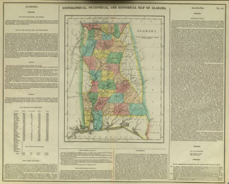 This early map of Alabama shows the development of many of the state's counties and provides population statistics (taken from the 1820 census). Also included is information about the various river systems, climate, soil, etc. Lastly, it provides a detailed history of the state from the time of de Soto's expedition to the present.