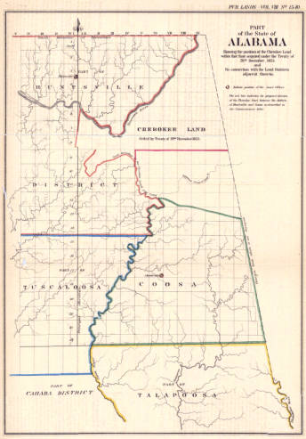 Part of the State of Alabama : showing the position of the Cherokee Land within that state acquired under the Treaty of 29th December, 1835, and its connection with the land districts adjacent thereto, c. 1861. Gift of Rucker Agee.