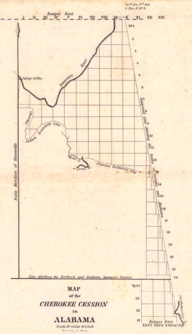 This sketch showing Cherokee lands in eastern Alabama, was included in the Annual Report of the Commissioner of the General Land Office as submitted to Congress on December 18, 1838. The Surveyor General of the Public Lands in Alabama, James H. Weakley, included it as part of his request for funds to survey the lands from which the Cherokee were being removed. Weakley estimates that it will cost $22,400 to survey the 5,600 miles of vacated land and states that, "the anticipated difficulties with that tribe have been adjusted, and settled satisfactorily to the Government and the Indians, and they are now in the progress of peaceable removal, and will all have left during the present autumn" (S. Doc. No. 17, 1838).