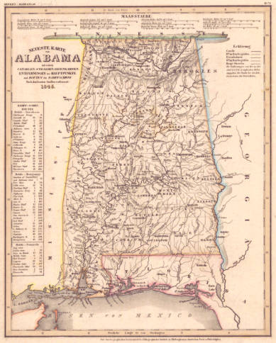 This map appeared in Julius Meyers's Handaltas, a German language atlas of the Americas. Most of the plates were derived largely from maps created by Henry S. Tanner. Although dated 1845, this map is obviously based on an earlier version. Cherokee and Choctaw lands are still shown even though both groups ceded their land and were removed from Alabama in the 1830's.