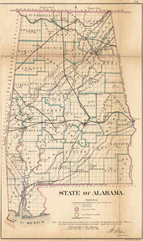 Published in 1872, this map shows the familiar outline of Alabama and its counties. Making an early appearance is the City of Birmingham in Jefferson County. Having been incorporated on December 19, 1871, this may be one of the first state maps to show Birmingham. Look closely, however, and you will notice another Birmingham in Jackson County. Established on December 29, 1845, and renamed Princeton on April 1, 1849, it should have disappeared from maps by this point (Harris, 1982). This map is, therefore, quite unique in that it shows both of Alabama's Birminghams even though the two towns never actually co-existed.