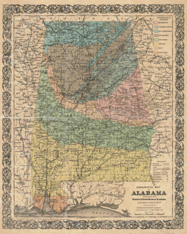 Born in Ireland, Michael Tuomey was the first State Geologist of Alabama. His appointment was approved on January 4, 1848, by Governor Reuben Chapman. Shortly after his appointment he produced an extensive report on the geology of Alabama. He also drew this, the first geological map of Alabama, in 1849. Thanks to Tuomey's work, "southern capitalists were induced for the first time to invest their funds in coal and iron companies. Tuomey's report set the Governor and the legislature to thinking that Alabama had possibly another industrial future besides growing cotton" (Armes, 1972, p. 103).