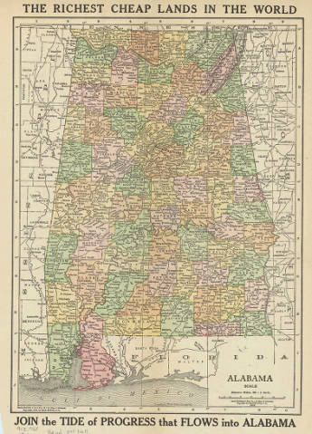 This early 20th century map of Alabama shows the counties, cities, towns, and railroads. The map encourages people to settle in Alabama by advertising the state as having the "Richest Cheap Lands in the World" and by telling people to "JOIN the TIDE of PROGRESS that FLOWS into ALABAMA." A copy of this map appeared in the 1912 edition of Alabama's New Era, the official bulletin of the State Immigration Department, the purpose of which was to "let the outside world know something of the unparalleled opportunities to be had in Alabama" (Alabama State Department of Immigration, 1912, p. 3).