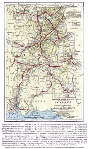 National highways map of the state of Alabama showing eighteen hundred miles of national highways proposed by the National Highways AssociationAlabama, 1913. Gift of Rucker Agee.