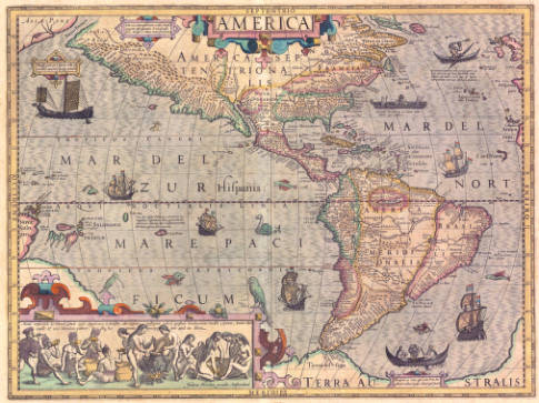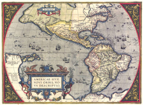 Abraham Ortelius was a Flemish cartographer who is widely credited with creating the first atlas. His work the Theatrum Orbis Terrarum was published in 1570 and enjoyed great success over the next 42 years (Burden, 1996). This is the "first map of the Americas to appear in a modern atlas" (Schwartz and Ehrenberg, 1980, p. 69). The continents of North and South America are instantly recognizable, despite the inaccurate depiction of the South American coastline. The large and "strategically placed cartouche hides a complete lack of knowledge of the southern waters of the Pacific" (Burden, 1996, p. 51).