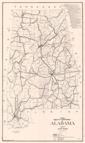Released in 1927, this map shows the system of state and federal roads in Alabama. The symbols on the legend indicate the surface of the road (paved, gravel, etc.) and there is even a symbol for projected roads. A detailed description of the federal roads in Alabama appears in the upper right corner. Alabama's Highway Department was hard at work maintaining and repairing the State's system of roads and undertaking the construction of new roads and bridges. Alabamians were eager to take advantage of the new roads as evidenced by the fact that 210,078 passenger vehicles were registered in Alabama in 1927 (Alabama State Highway Department, 1927).