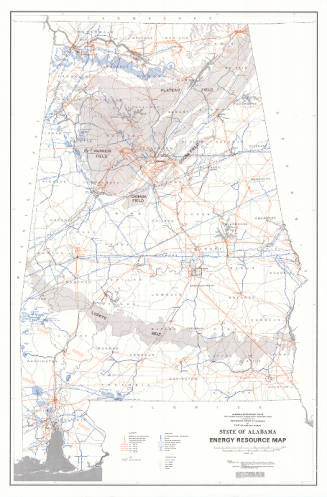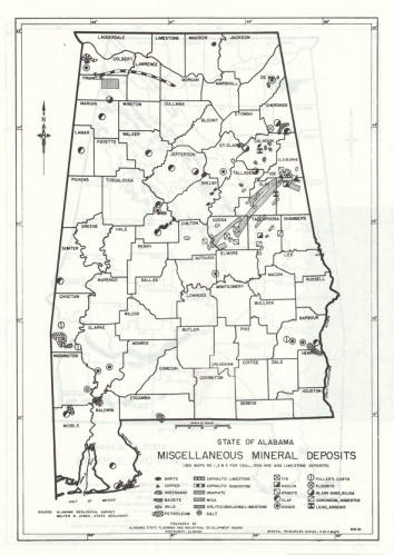 Using simplistic illustrations, this map shows the locations of various mineral deposits throughout the state. Produced by the Alabama Geological Survey in 1960, we learn that several counties in eastern Alabama had gold deposits, that there were pockets of petroleum in southwestern Alabama, and that Fuller's earth, which is an absorbent substance used in cat litter, could be found in Barbour County.