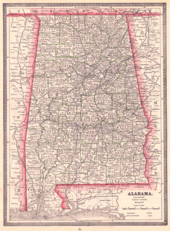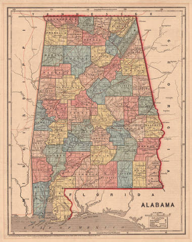 Taken from engraver and publisher George F. Cram's Unrivaled Family Atlas of the World, this map shows Alabama with all its counties, towns, rivers, and railroads. George F. Cram started his publishing company in Chicago in 1869 and went on to publish maps and atlases well into the 20th century (Tooley, 1999). By 1885 almost all of Alabama's 67 counties were well established, with the exception of Houston County which was formed from parts of Dale, Geneva, and Henry counties in 1903. While small changes to the county boundaries would continue to occur through the 1980's, this map shows Alabama much as it is today (Long, 1993).