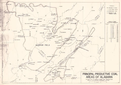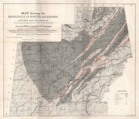Hermann Alber, a German born civil and mining engineer, drew this map showing the location and types of minerals in north Alabama. Its coverage extends to the area in and around Jefferson County. It strikingly illustrates the dominance of the Warrior Coal Field. State geologist, Michael Toumey identified 3 major coal fields in Alabama and named them the "Warrior, Cahaba, and Coosa fields for the rivers which drain them" (White, 1981, p. 33). The Warrior Coal Field was the largest by far and the most productive. In addition to coal, this map also shows the location of the marble quarries in and around Sylacauga in Talladega County. Alabama marble gained fame when sculptor Guiseppe Moretti (creator of Birmingham's Vulcan) began using it for his work in the early 1900's.