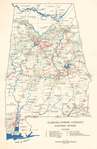This map shows the distribution of electricity across the area of Alabama that was served by the Alabama Power Company. Founded in 1906, the Alabama Power Company provides electricity and hydroelectric power to almost all of the state. The northern portion of Alabama is served by the Tennessee Valley Authority (TVA). Built between 1912 and 1928, the four hydroelectric dams on the Coosa and Tallapoosa Rivers (Martin, Lay, Mitchell, and Jordan Dams) represented, "the largest, most complex, and most expensive construction projects in the history of the state" (Jackson, 1997, p. 1).