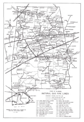 Natural gas and petroleum are the focus of this map. It shows the pipelines that carried gas and petroleum across the state as well as the names of the gas companies that owned them as of July 1964. Alabama's reserves of oil and natural gas have never received as much attention as its deposits of coal and iron ore. However, Alabama has a long history of oil and gas exploration and drilling, beginning in 1884 in Choctaw County. It took several years, but oil was eventually discovered in Alabama in 1887 near Decatur in Morgan County. Natural gas was discovered a few years later in Madison County in 1902 (Hughes, 1993).