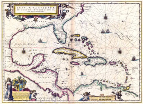 The Blaeu family of Amsterdam produced many of the most beautiful and celebrated cartographic works to come out of the Age of Discovery. Willem Blaeu, who studied under Tycho Brahe, founded a publishing house and mapmaking firm in 1596. After Willem's death, the business passed to his sons and continued to operate until a fire destroyed their workshop in 1672 (Tooley, 1999). This map draws from an earlier, extremely rare chart by Hessel Gerritsz (Burden, 1996). It shows the southern portion of North America, Mexico's Yucatan Peninsula, the West Indies, and Central America. Virginia is clearly marked and the entire southern portion of North America is called Florida, as was typical for maps of this period. The diagonal lines emanating from the compass roses are called rhumb lines and were used for navigation. The Blaeus lushly decorated their maps and this one is no exception. The cartouche at the top left corner has several frightening looking lizards, a bat, snakes, and a large turtle.