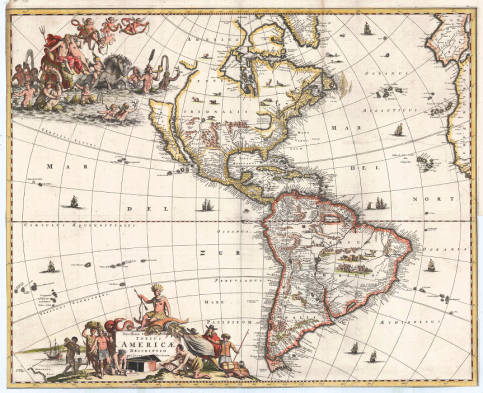 Jodocus Hondius and his descendants were prolific engravers, publishers, and mapmakers. Hondius was born in Belgium but eventually settled and worked in Amsterdam. This striking map of North and South America appeared in the atlas he produced based, in part, on the work of Gerard Mercator, creator of the Mercator projection. It includes elements such as the skillfully drawn sailing ships and sea monsters that were common features of early maps. The depictions of native people fishing and cooking were taken directly from engravings that had previously appeared in Theodore de Bry's Grand Voyages (Burden, 1996). Interestingly, off the coast of Ireland is a small island called Brasil. This island, while completely fictional, nonetheless appeared on globes and maps for over 500 years (Boston Public Library Norman B. Leventhal Map Center, 2016).