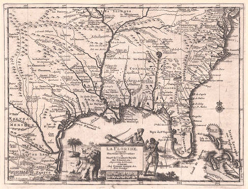 Pieter van der Aa was a publisher, editor, and bookseller in the Dutch city of Leiden. This map appeared in his Le Nouveau Théâtre du Monde ou la Géographie Royale which was published in 1713. It appears to be heavily derived from an earlier map by the foremost French cartographer, Guillaume Delisle (Tooley, 1999). Many Native American villages and tribes are marked, including the Alihamous tribe in the area of present day Alabama. This is one of the many variations we see on the name of the tribe from which Alabama took its name. This map has a large decorative cartouche at the bottom center which shows Native Americans in friendly conversation on one side and a smiling lion on the other. A palm tree and deer are in the background (Cumming, 1998, p. 204).